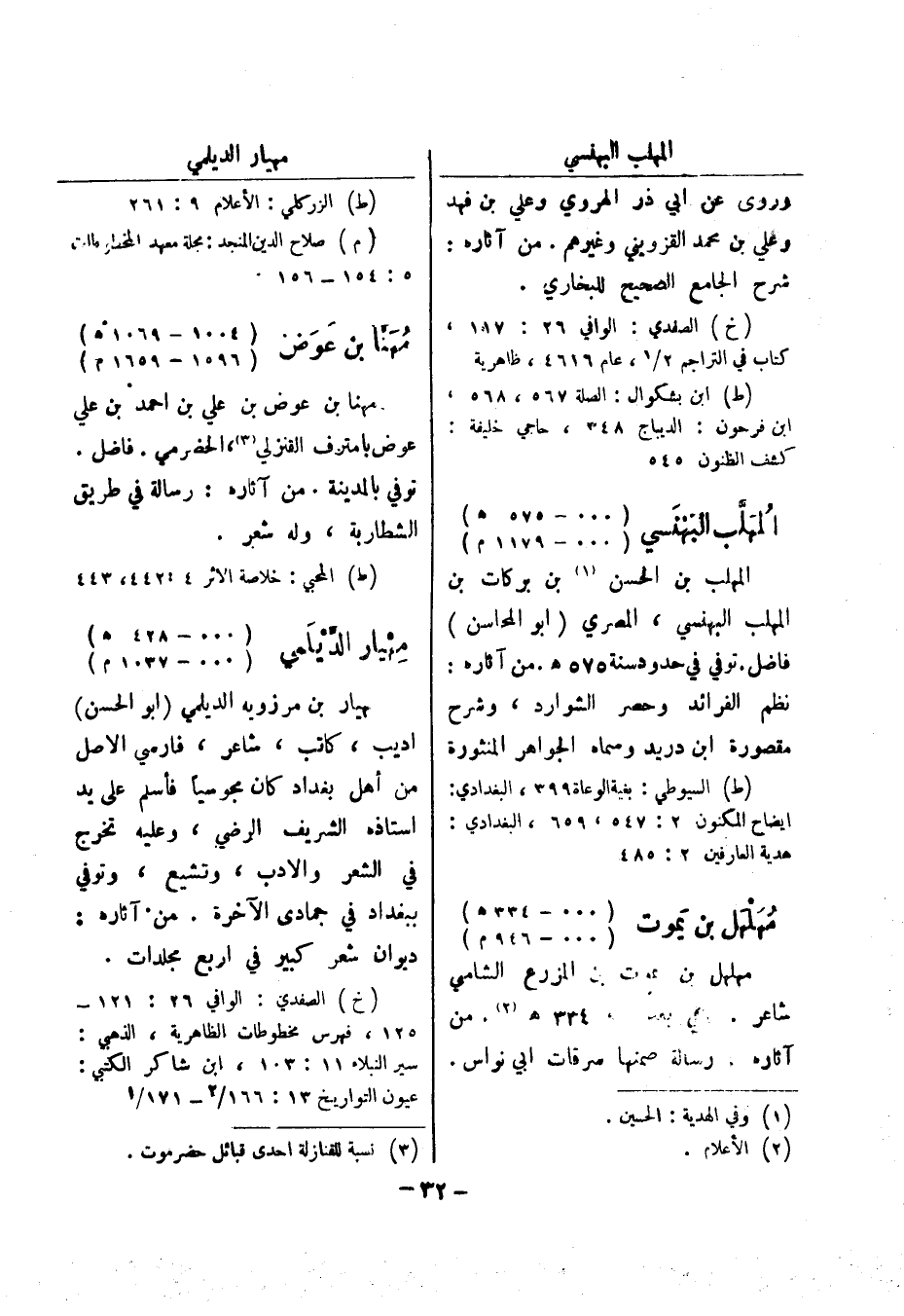 (خ) الصفدي: الوافي 26: 187، كتاب في التراجم 2 / 1، عام 4616، ظاهرية (ط) ابن بشكوال: الصلة 567، 568، ابن فرحون: الديباج 348، حاجي خليفة: كشف الظنون 545 المهلب البهنسي (000 - 575 هـ) (000 - 1179 م) المهلب بن الحسن (1) بن بركات بن المهلب البهنسي، المصري (أبو المحاسن) فاضل.