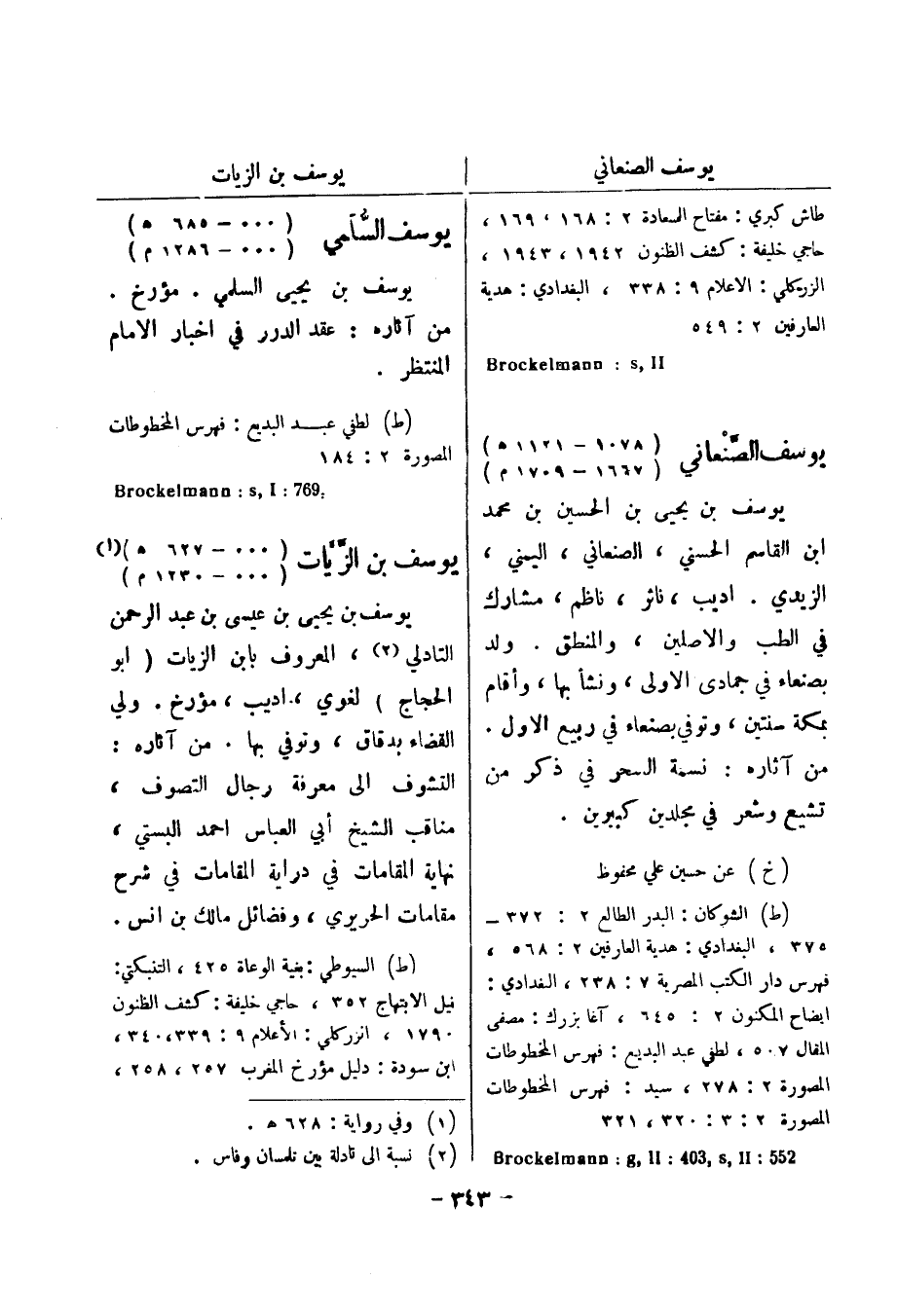طاش كبري: مفتاح السعادة 2: 168، 169، حاجي خليفة: كشف الظنون 1942، 1943، الزركلي: الاعلام 9: 338، البغدادي: هدية العارفين 2: 549 Brockelmann: s , II يوسف الصنعاني (1078 - 1121 هـ) (1667 - 1709 م) يوسف بن يحيى بن الحسين بن محمد ابن القاسم الحسني، الصنعاني، اليمني،
