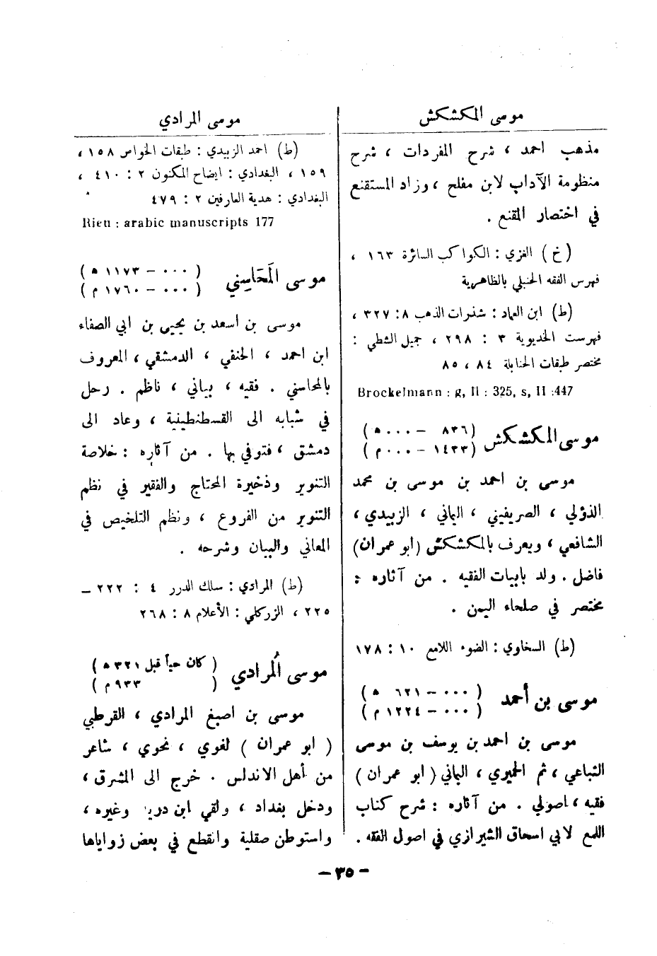(ط) ابن العماد شذرات الذهب 8: 327، فهرست الخديوية 3: 298، جميل الشطي: مختصر طبقات الحنابلة 84، 85 447: Brockelmann: g , ll: s 523 , ll موسى المكشكش (836 - 000 هـ) (1433 - 000 م) موسى بن احمد بن موسى بن محمد الذؤلي، الصريفيني، اليماني، الزبيدي، الشافعي، ويعرف بالمكشكش (أبو عمران) فاضل.