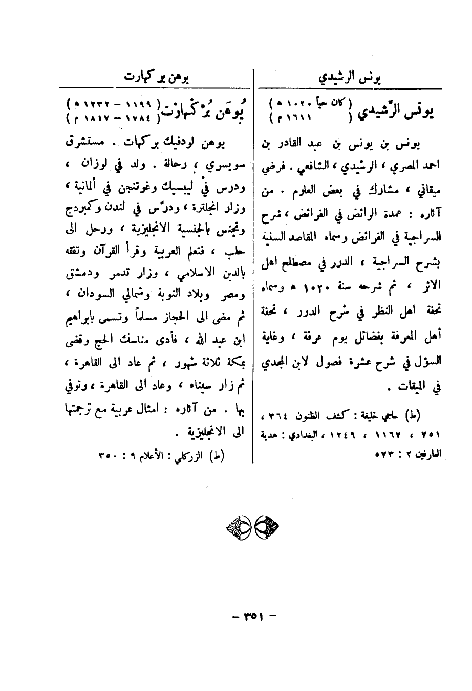 (ط) حاجي خليفة: كشف الظنون 364، 751، 1167، 1249، البغدادي: هدية العارفين 2: 573 يوهن بركهارت (1199 - 1232 هـ)