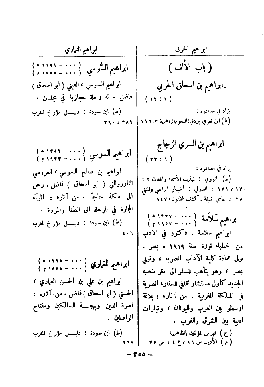 ابراهيم بن اسحاق الحربي (1: 12) يزاد في مصادره: (ط) ابن تغري بردي: النجوم الزاهرة 3: 116 ابراهيم بن السري الزجاج (1: 33) يزاد في مصادره: (ط) النووي: تهذيب الاسماء واللغات 2: 170، 171، الصولي: أخبار الراضي والمتقي 28، حاجي خليفة: كشف الظنون 1471 ابراهيم سلامة (000 - 1377 هـ) (000 - 1957 م) ابراهيم سلامة.