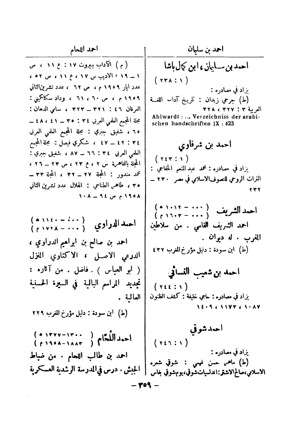 (ط) ابن سودة: دليل مؤرخ المغرب 432 احمد بن شعيب النسائي (1: 244) يزاد في مصادره: حاجي خليفة: كشف الظنون 1087، 1173، 1409 احمد شوقي (1: 246) يزاد في مصادره: (ط) ماهر حسن فهمي: شوقي شعره الاسلامي، صالح الاشتر: اندلسيات شوقي، يوم شوقي بفاس (م) الآداب بيروت 17: ع 11، ص 1 - 19، الاديب س 17، ع 11، ص 52، عدد ايار 1959 م، ص 62، عدد تشرين الثاني 1959 م، ص 60، 61، وداد سكاكيني: العرفان 46: 321 - 323، سامي الدهان: