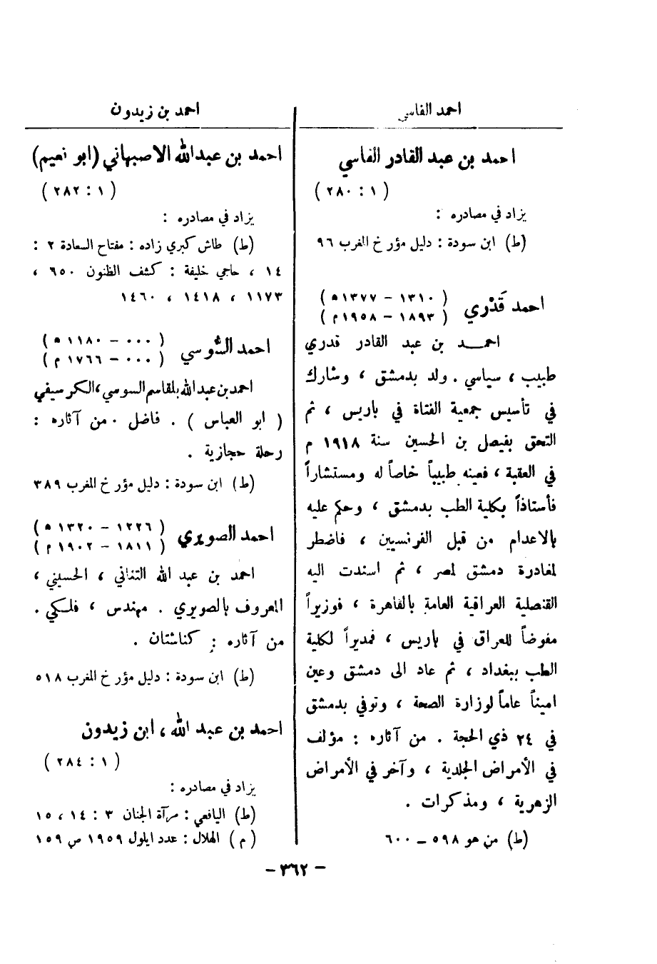 احمد بن عبد القادر الفاسي (1: 280) يزاد في مصادره: (ط) ابن سودة: دليل مؤرخ المغرب 96 احمد قدري (1310 - 1377 هـ) (1893 - 1958 م) احمد بن عبد القادر قدري طبيب، سياسي.
