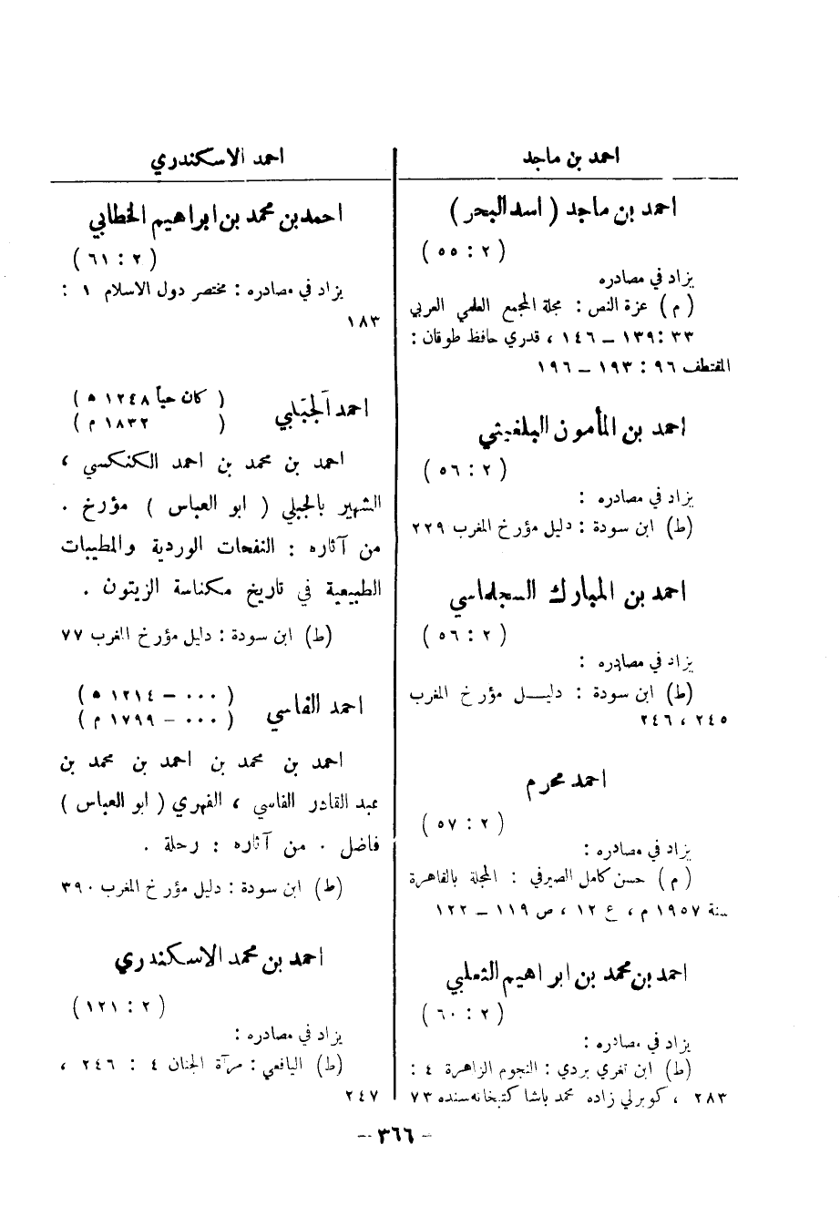 احمد بن ماجد (اسد البحر) (2: 55) يزاد في مصادره: (م) عزة النص: مجلة المجمع العلمي العربي 33: 139 - 146، قدري حافظ طوقان: المقتطف 96: 193 - 196 احمد بن المأمون البلغيثي (2: 56) يزاد في مصادره: (ط) ابن سودة: دليل مؤرخ المغرب 229 احمد بن المبارك السجلماسي (2: 56) يزاد في مصادره: