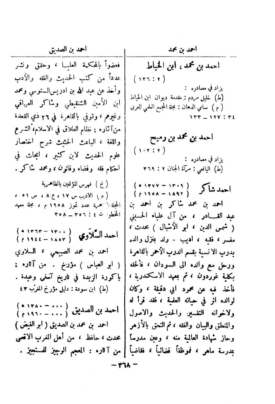 (ط) ابن سودة: دليل مؤرخ المغرب 43 احمد بن الصديق (000 - 1380 هـ) (000 - 1960 م) احمد بن محمد بن الصديق (أبو الفيض) محدث، حافظ، من أهل المغرب الاقصى من آثاره: المعجم الوجيز للمستجيز.