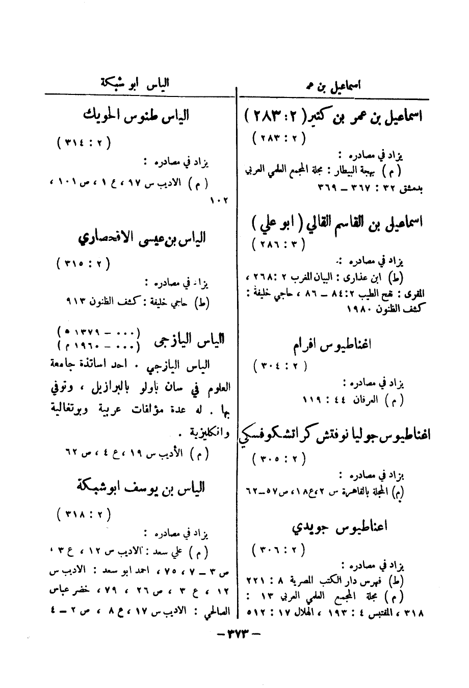 اسماعيل بن عمر بن كثير (2: 283) (2: 283) يزاد في مصادره: (م) بهجة البيطار: مجلة المجمع العلمي العربي بدمشق 32: 367 - 369 اسماعيل بن القاسم القالي (أبو علي) (3: 286) يزاد في مصاره: (ط) ابن عذارى: البيان المغرب 2: 268، المقرى: نفح الطيب 2: 84 - 86، حاجي خليفة: كشف الظنون 1980 اغناطيوس افرام (2: 304) يزاد في مصادره: