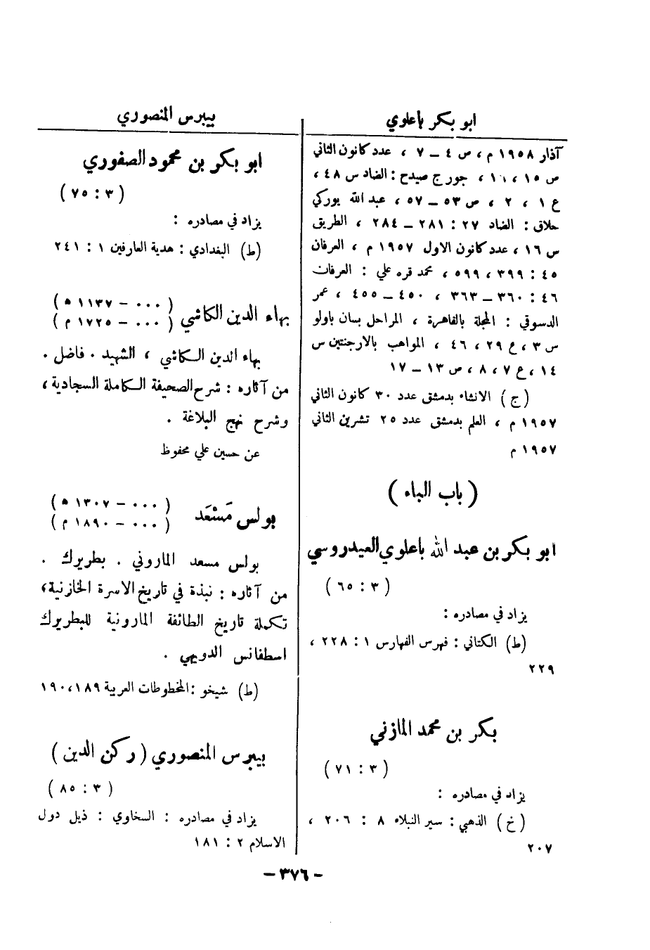 ابو بكر بن محمود الصفوري (3: 75) يزاد في مصادره: (ط) البغدادي: هدية العارفين 1: 241 بهاء الدين الكاشي (000 - 1137 هـ) (000 - 1725 م) بهاء الدين الكاشي، الشهيد.