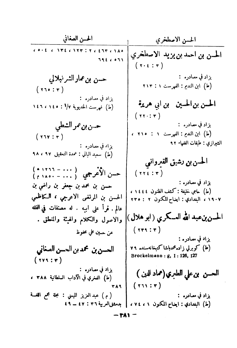 الشيرازي: طبقات الفقهاء 92 الحسن بن رشيق القيرواني (3: 224) يزاد في مصادره: (ط) حاجي خليفة: كشف الظنون 1444، 1907، البغدادي: ايضاح المكنون 2: 235 الحسن بن عبد الله العسكري (أبو هلال) (3: 239) يزاد في مصادره: (ط) كوبرلي زاده محمد باشا كتبخانه سنده 79 127 , 126: Brockelmann: g , I الحسن بن علي الطبري (عماد الدين) (3: 261) يزاد في مصادره: (ط) البغدادي: ايضاح المكنون 1، 74، 185، 463، 2: 123، 134، 504، 561، 694 حسن بن عمار الشرنبلالي (3: 265) يزاد في مصادره: (ط) فهرست الخديوية 7 / 1: 145، 146 حسن بن عمر الشطي