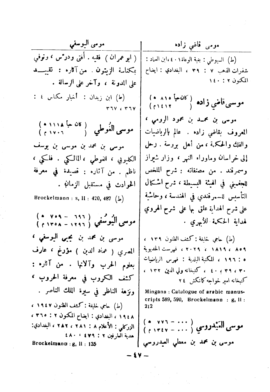 (ط) السيوطي: بغية الوعاة 401، ابن العماد: شذرات الذهب 7: 39، البغدادي: ايضاح المكنون 2: 140 موسى قاضي زاده (كان حيا 815 هـ) (1412 م) موسى بن محمد بن محمود الرومي، المعروف بقاضي زاده.