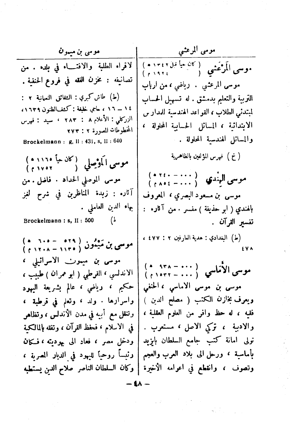 ط) 500: Brockelmann: s , II موسى بن ميمون (529 - 605 هـ) (1135 - 1208 م) موسى بن ميمون الاسرائيلي، الاندلسي، القرطبي (أبو عمران) طبيب، حكيم، رياضي، عالم بشريعة اليهود واسرارها.