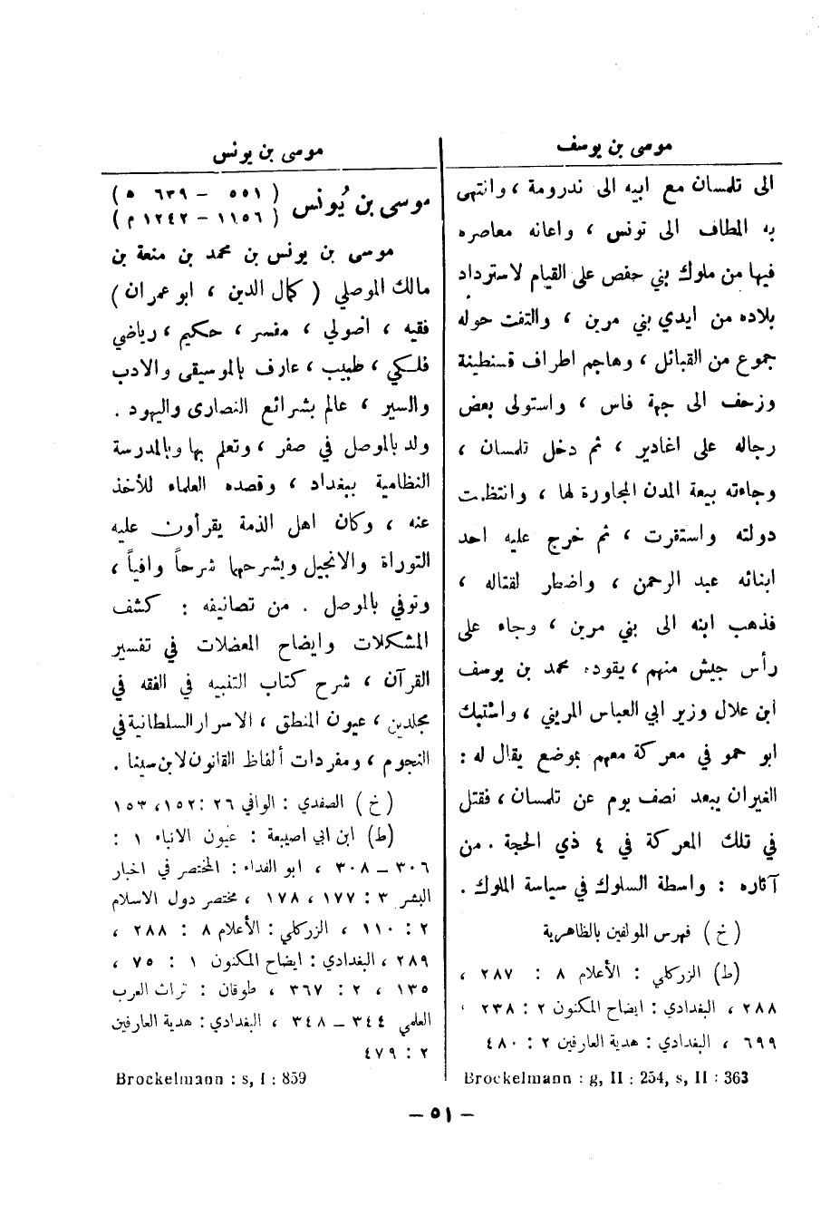 288، البغدادي: ايضاح المكنون 2: 238، 699، البغدادي: هدية العارفين 2: 480 363: Brockelmann: g , II: 452 , s , II موسى بن يونس (511 - 639 هـ) (1156 - 1242 م) موسى بن يونس بن محمد بن منعة بن مالك الموصلي (كمال الدين، أبو عمران) فقيه، اصولي، مفسر، حكيم، رياضي فلكي، طبيب، عارف بالموسيقى والادب والسير، عالم بشرائع النصارى واليهود.