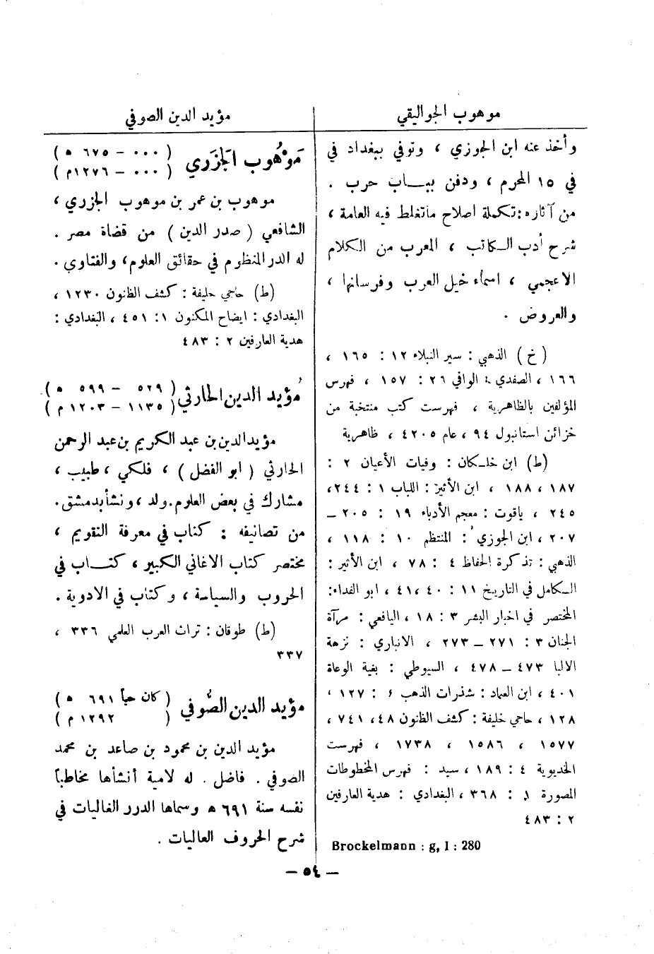 (خ) الذهبي: سير النبلاء 12: 165، 166، الصفدي، الوافي 26: 157، فهرس المؤلفين بالظاهرية، فهرست كتب منتخبة من خزائن استانبول 94، عام 4205، ظاهرية (ط) ابن خلكان: وفيات الاعيان 2: 187، 188، ابن الاثير: اللباب 1: 244، 245، ياقوت: معجم الادباء 19: 205 207، ابن الجوزي: المنتظم 10: 118، الذهبي: تذكرة الحفاظ 4: 78، ابن الاثير: الكامل في التاريخ 11: 40، 41، أبو الفداء: المختصر في اخبار البشر 3: 18، اليافعي: مرآة الجنان 3: 271 - 273، الانباري: نزهة الالبا 473 - 478، السيوطي: بغية الوعاة 401، ابن العماد: شذرات الذهب 6: 127، 128، حاجي خليفة: كشف الظنون 48، 741، 1577، 1586، 1738، فهرست الخديوية 4: 189، سيد: فهرس المخطوطات المصورة 1: 368، البغدادي: هدية العارفين 2: 483 280: Brockelmann: g , I موهوب الجزري (000 - 675 هـ) (000 - 1276 م)