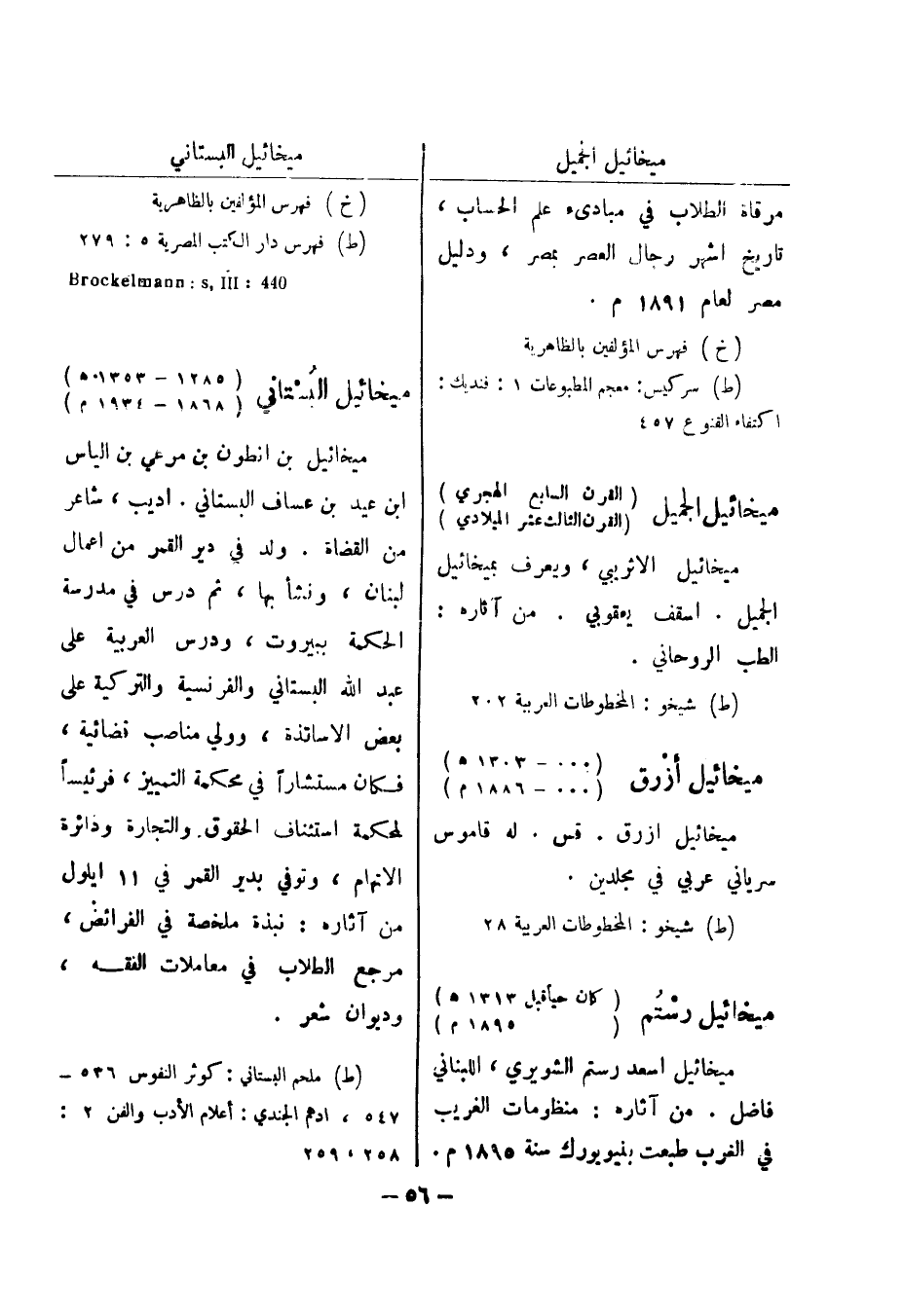 (خ) فهرس المؤلفين بالظاهرية (ط) فهرس دار الكتب المصرية 5: 279 440: Brockelmann: s , III ميخائيل البستاني (1285 - 1353 هـ) (1868 - 1934 م) ميخائيل بن انطون بن مرعي بن الياس ابن عيد بن عساف البستاني.