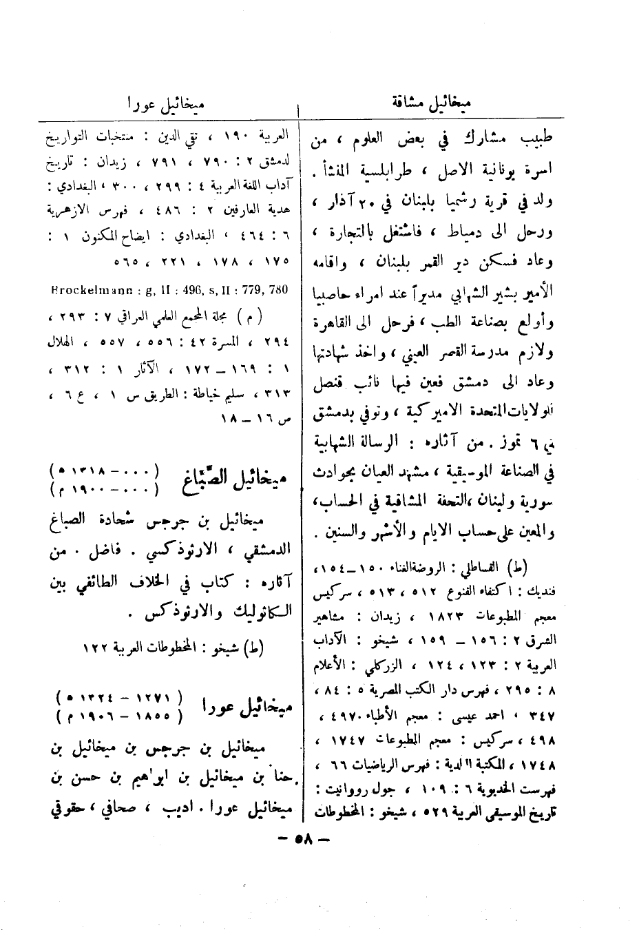 (م) مجلة المجمع العلمي العراقي 7: 293، 294، المسرة 42: 556، 557، الهلال 1: 169 - 172، الآثار 1: 312، 313، سليم خياطة: الطريق س 1، ع 6، ص 16 - 18 ميخائيل الصباغ (000 - 1318 هـ) (000 - 1900 م) ميخائيل بن جرجس شحادة الصباغ الدمشقي، الارثوذكسي.