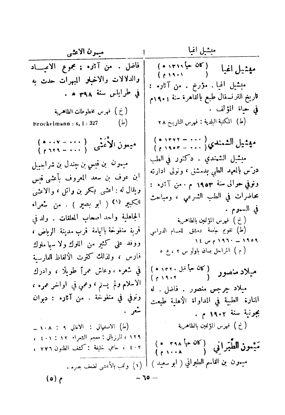 (خ) فهرس مخطوطات الظاهرية (ط) 327: Brockelmann: s , I ميمون الاعشى (000 - 007 هـ) (000 - 629 م) ميمون بن قيس بن جندل بن شراحبيل ابن عوف بن سعد المعروف بأعشى قيس ويقال له: اعشى بكر بن وائل، والاعشى الكبير (1) (أبو بصير) .