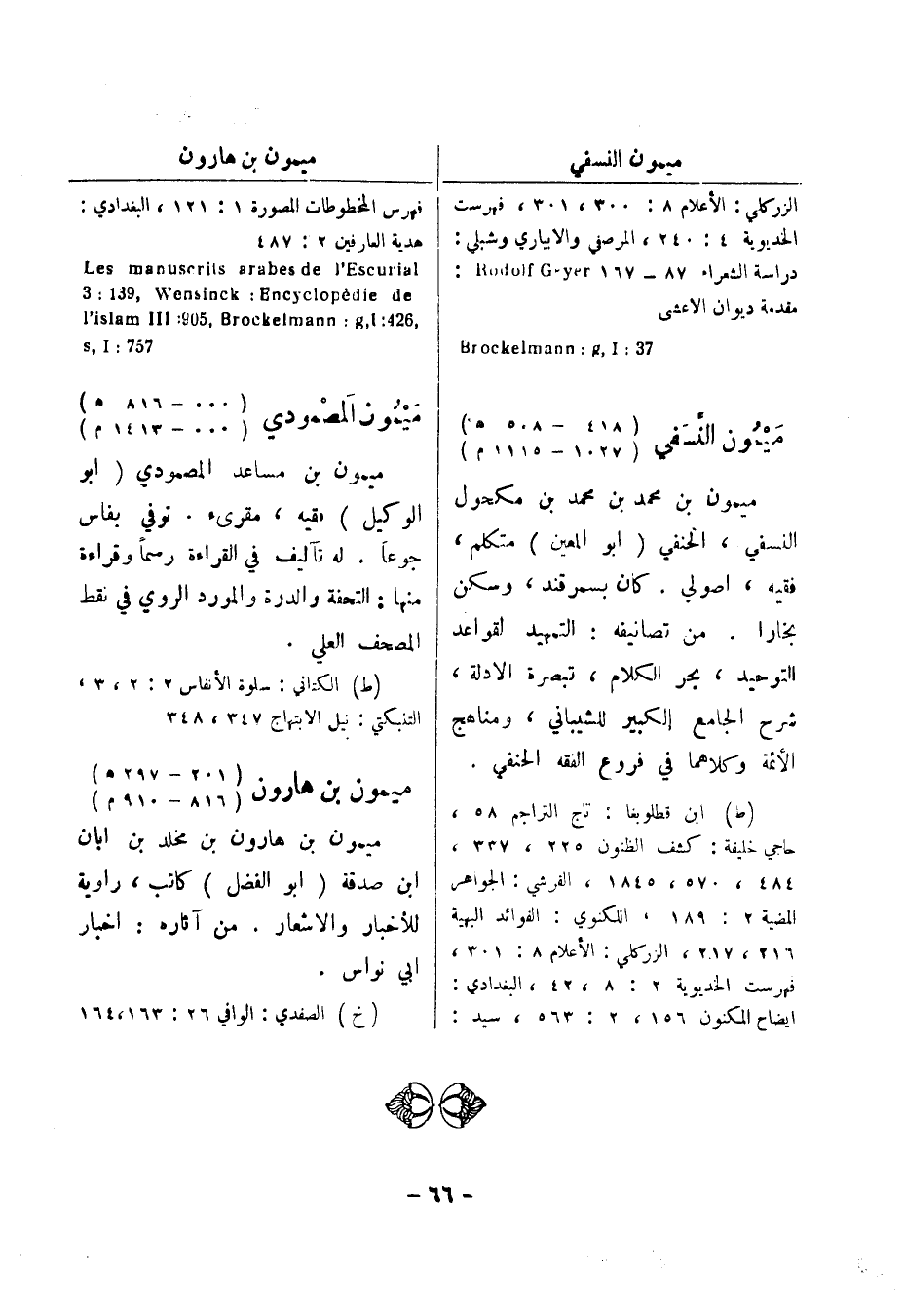 الزركلي: الاعلام 8: 300، 301، فهرست الخديوية 4: 240، المرصفي والابياري وشبلي: دراسة الشعراء 87 - 167: Bodolf Geyer مقدمة ديوان الاعشى 37: Brockelmann: g , I ميمون النسفي (418 - 508 هـ) (1027 - 1115 م) ميمون بن محمد بن محمد بن مكحول النسفي، الحنفي (أبو المعين) متكلم، فقيه، اصولي.