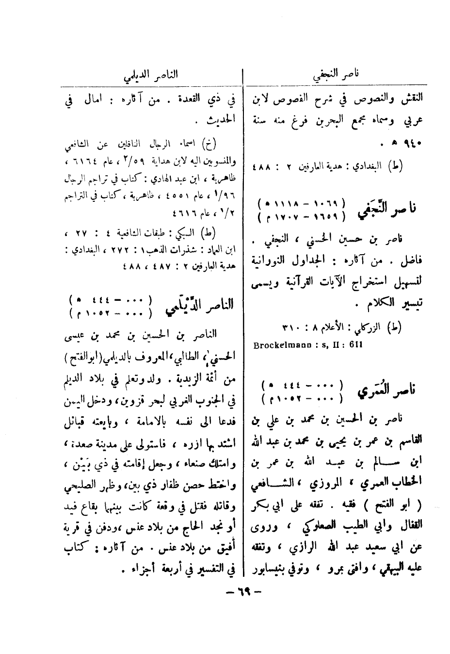 (ط) البغدادي: هدية العارفين 2: 488 ناصر النجفي (1069 - 1118 هـ) (1659 - 1707 م) ناصر بن حسين الحسني، النجفي.