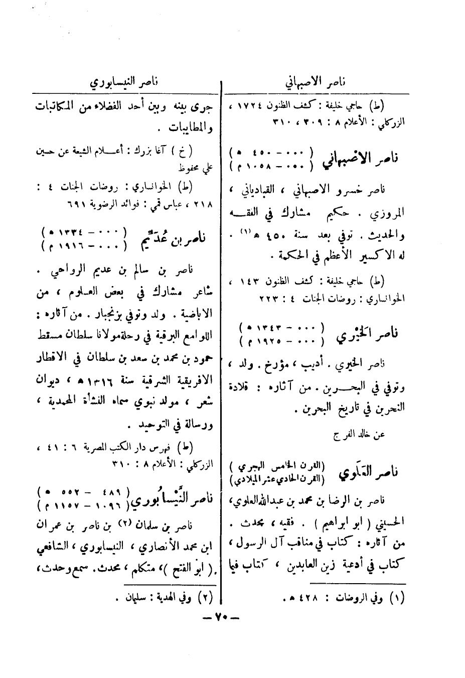 (ط) حاجي خليفة: كشف الظنون 1724، الزركلي: الاعلام 8: 309، 310 ناصر الاصبهاني (000 - 450 هـ) (000 - 1058 م) ناصر خسرو الاصبهاني، القبادياني، المروزي.