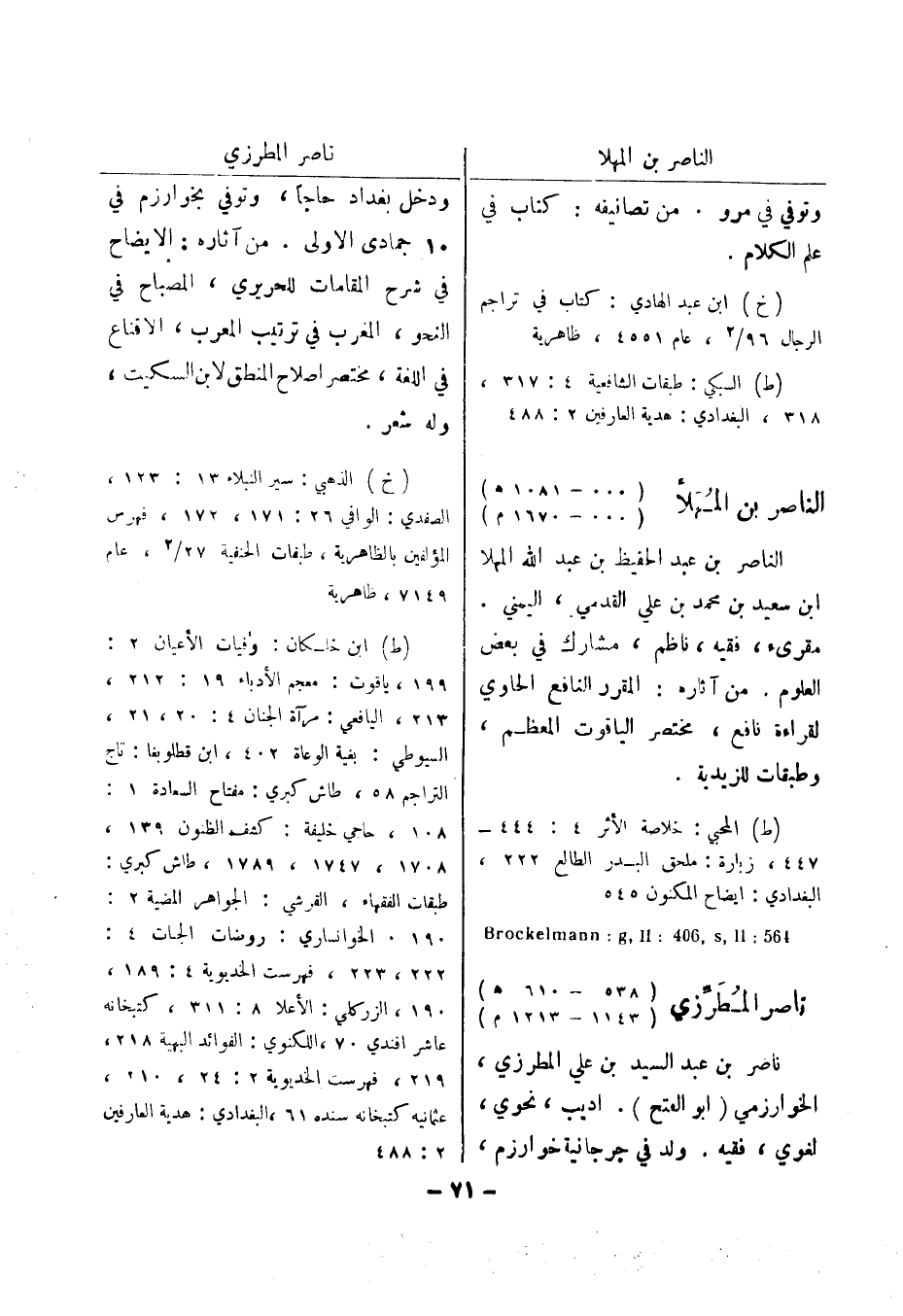 (ط) المحبي: خلاصة الاثر 4: 444 447، زبارة: ملحق البدر الطالع 222، البغدادي: ايضاح المكنون 545 564: Brockelmann: g , II: 604 , s , II ناصر المطرزي (538 - 610 هـ) (1143 - 1213 م) ناصر بن عبد السيد بن علي المطرزي، الخوارزمي (أبو الفتح) .