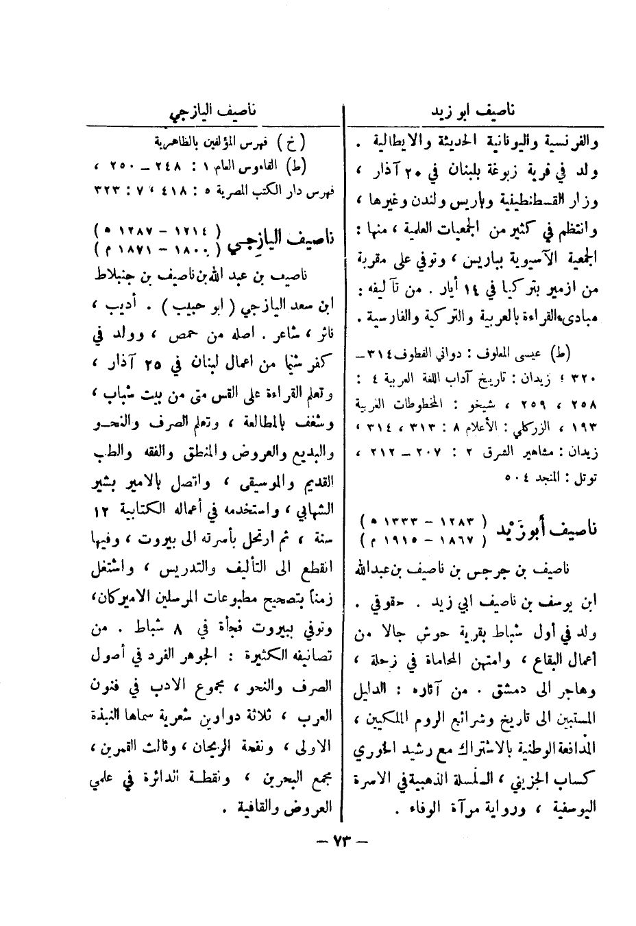 (خ) فهرس المؤلفين بالظاهرية (ط) القاموس العام 1: 248 - 250، فهرس دار الكتب المصرية 5: 418، 7: 323 ناصيف اليازجي (1214 - 1287 هـ) (1800 - 1871 م) ناصيف بن عبد الله بن ناصيف بن جنبلاط ابن سعد اليازجي (أبو حبيب) .
