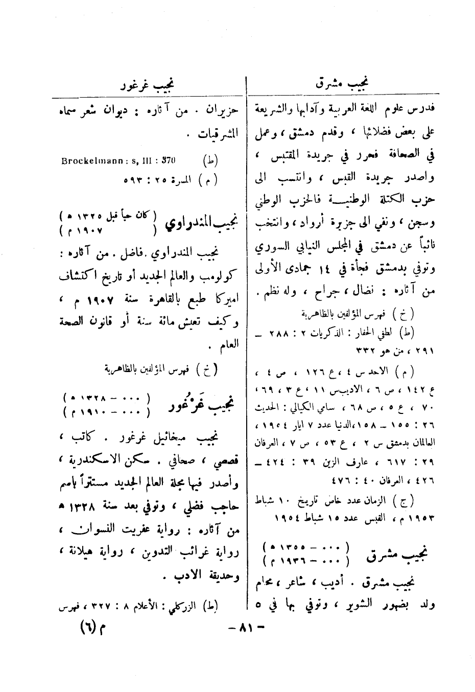 العالمان بدمشق س 2، ع 53، ص 7، العرفان 29: 617، عارف الزين 39: 424 - 426، العرفان 40: 476 (ج) الزمان عدد خاص تاريخ 10 شباط 1953 م، القبس عدد 15 شباط 1954 نجيب مشرق (000 - 1355 هـ) (000 - 1936 م) نجيب مشرق.