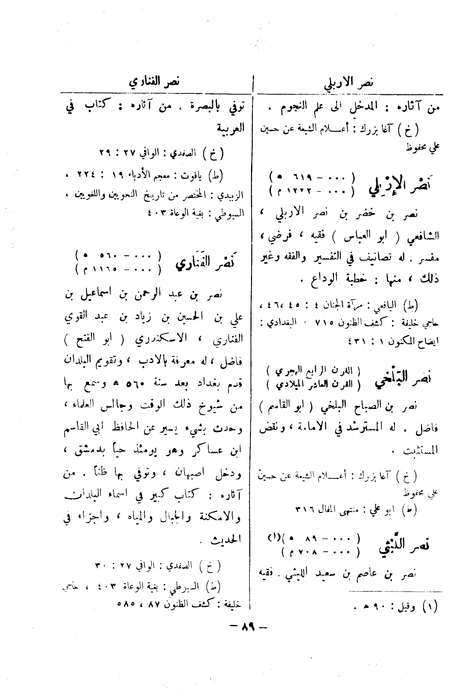 (خ) آغا بزرك: أعلام الشيعة عن حسين علي محفوظ (ط) أبو علي: منتهى المقال 316 نصر الليثي (000 - 89 هـ) (1) (000 - 708 م) نصر بن عاصم بن سعيد الليثي.