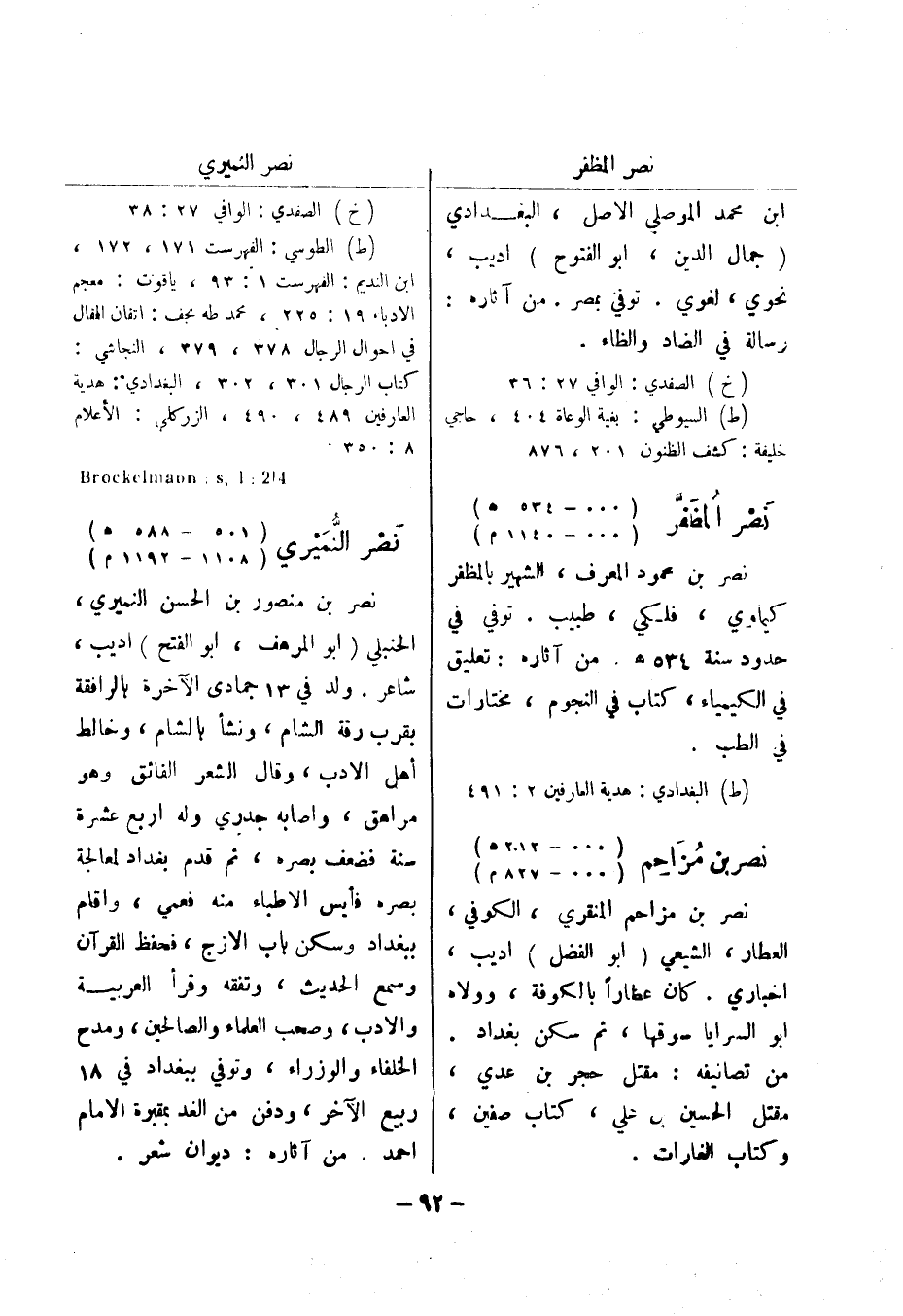 214: Brockelmann: s , I نصر النميري (501 - 588 هـ) (1108 - 1192 م) نصر بن منصور بن الحسن النميري، الحنبلي (أبو المرهف، أبو الفتح) اديب، شاعر.