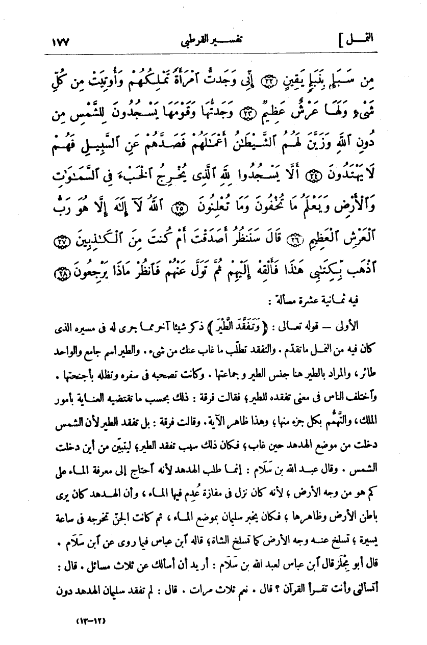 فِيهِ ثَمَانِ عَشْرَةَ مَسْأَلَةً: الْأُولَى- قَوْلُهُ تَعَالَى: (وَتَفَقَّدَ الطَّيْرَ) ذَكَرَ شَيْئًا آخَرَ مِمَّا جَرَى لَهُ فِي مَسِيرِهِ الَّذِي كَانَ فِيهِ مِنَ النَّمْلِ مَا تَقَدَّمَ. وَالتَّفَقُّدُ تَطَلُّبُ مَا غَابَ عنك من شي. وَالطَّيْرُ اسْمٌ جَامِعٌ وَالْوَاحِدُ طَائِرٌ، وَالْمُرَادُ بِالطَّيْرِ هُنَا جِنْسُ الطَّيْرِ وَجَمَاعَتُهَا. وَكَانَتْ تَصْحَبُهُ فِي سَفَرِهِ وَتُظِلُّهُ بِأَجْنِحَتِهَا. وَاخْتَلَفَ النَّاسُ فِي مَعْنَى تَفَقُّدِهِ لِلطَّيْرِ، فَقَالَتْ فِرْقَةٌ: ذَلِكَ بِحَسَبِ مَا تَقْتَضِيهِ الْعِنَايَةُ بِأُمُورِ الْمُلْكِ، وَالتَّهَمُّمُ بِكُلِّ جُزْءٍ مِنْهَا، وَهَذَا ظَاهِرُ الْآيَةِ. وَقَالَتْ فِرْقَةٌ: بَلْ تَفَقَّدَ الطَّيْرَ لِأَنَّ الشَّمْسَ دَخَلَتْ مِنْ مَوْضِعِ الْهُدْهُدِ حِينَ غَابَ، فَكَانَ ذَلِكَ سَبَبَ تَفَقُّدِ الطَّيْرِ، لِيَتَبَيَّنَ مِنْ أَيْنَ دَخَلَتِ الشَّمْسُ. وَقَالَ عَبْدُ اللَّهِ بْنُ سَلَامٍ: إِنَّمَا طَلَبَ الْهُدْهُدَ لِأَنَّهُ احْتَاجَ إِلَى مَعْرِفَةِ الْمَاءِ عَلَى كَمْ هُوَ مِنْ وَجْهِ الْأَرْضِ، لِأَنَّهُ كَانَ نَزَلَ فِي مَفَازَةٍ عَدِمَ فِيهَا الْمَاءَ، وَأَنَّ الْهُدْهُدَ كَانَ يَرَى بَاطِنَ الْأَرْضِ وَظَاهِرَهَا، فَكَانَ يُخْبِرُ سُلَيْمَانَ بِمَوْضِعِ الْمَاءِ، ثُمَّ كَانَتِ الْجِنُّ تُخْرِجُهُ فِي سَاعَةٍ يَسِيرَةٍ، تَسْلَخُ عَنْهُ وَجْهَ الْأَرْضِ كَمَا تُسْلَخُ الشَّاةُ، قَالَهُ ابْنُ عَبَّاسٍ فِيمَا رُوِيَ عَنِ ابْنِ سَلَامٍ. قَالَ أَبُو مِجْلَزٍ قَالَ ابْنُ عَبَّاسٍ لِعَبْدِ اللَّهِ بْنِ سَلَامٍ: أُرِيدُ أَنْ أَسْأَلَكَ عَنْ ثَلَاثِ مَسَائِلَ. قَالَ: أَتَسْأَلُنِي وَأَنْتَ تَقْرَأُ الْقُرْآنَ؟ قَالَ: نَعَمْ ثَلَاثَ مَرَّاتٍ. قَالَ: لِمَ تَفَقَّدَ سُلَيْمَانُ الْهُدْهُدَ دُونَ