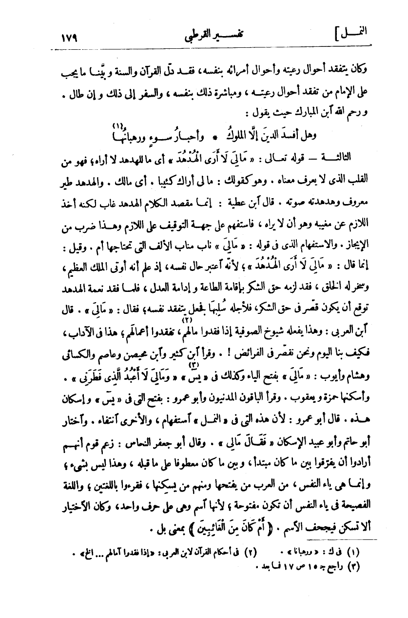 الثَّالِثَةُ- قَوْلُهُ تَعَالَى: (مَا لِيَ لَا أَرَى الْهُدْهُدَ) أَيْ مَا لِلْهُدْهُدِ لَا أَرَاهُ، فَهُوَ مِنَ الْقَلْبِ الَّذِي لَا يُعْرَفُ مَعْنَاهُ. وَهُوَ كقولك: مالي أراك كئيبا. أي مالك. وَالْهُدْهُدُ طَيْرٌ مَعْرُوفٌ وَهَدْهَدَتُهُ صَوْتُهُ. قَالَ ابْنُ عَطِيَّةَ: إِنَّمَا مَقْصِدُ الْكَلَامِ الْهُدْهُدُ غَابَ لَكِنَّهُ أَخَذَ اللَّازِمَ عَنْ مَغِيبِهِ وَهُوَ أَنْ لَا يَرَاهُ، فَاسْتَفْهَمَ عَلَى جِهَةِ التَّوْقِيفِ عَلَى اللَّازِمِ وَهَذَا ضَرْبٌ مِنَ الْإِيجَازِ. وَالِاسْتِفْهَامُ الَّذِي فِي قَوْلِهِ:" مَا لِيَ" نَابَ مَنَابَ الْأَلِفِ الَّتِي تَحْتَاجُهَا أَمْ. وَقِيلَ: إِنَّمَا قَالَ:" مَا لِيَ لَا أَرَى الْهُدْهُدَ"، لِأَنَّهُ اعْتَبَرَ حَالَ نَفْسِهِ، إِذْ عَلِمَ أَنَّهُ أُوتِيَ الْمُلْكَ الْعَظِيمَ، وَسُخِّرَ لَهُ الْخَلْقُ، فَقَدْ لَزِمَهُ حَقُّ الشُّكْرِ بِإِقَامَةِ الطَّاعَةِ وَإِدَامَةِ الْعَدْلِ، فَلَمَّا فَقَدَ نِعْمَةَ الْهُدْهُدِ تَوَقَّعَ أَنْ يَكُونَ قَصَّرَ فِي حَقِّ الشُّكْرِ، فَلِأَجْلِهِ سُلِبَهَا فَجَعَلَ يَتَفَقَّدُ نَفْسَهُ، فَقَالَ: مَا لِيَ". قَالَ ابْنُ الْعَرَبِيِّ: وَهَذَا يَفْعَلُهُ شُيُوخُ الصوفية إذا فقدوا مالهم «٢»، تَفَقَّدُوا أَعْمَالَهُمْ، هَذَا فِي الْآدَابِ، فَكَيْفَ بِنَا الْيَوْمَ وَنَحْنُ نُقَصِّرُ فِي الْفَرَائِضِ!. وَقَرَأَ ابْنُ كَثِيرٍ وَابْنُ مُحَيْصِنٍ وَعَاصِمٌ وَالْكِسَائِيُّ وَهِشَامٌ وَأَيُّوبُ:" مالي" بِفَتْحِ الْيَاءِ وَكَذَلِكَ فِي" يس"" وَمَا لِيَ لَا أَعْبُدُ الَّذِي فَطَرَنِي". وَأَسْكَنَهَا حَمْزَةُ وَيَعْقُوبُ. وَقَرَأَ الْبَاقُونَ الْمَدَنِيُّونَ وَأَبُو عَمْرٍو: بِفَتْحِ الَّتِي فِي" يس" وَإِسْكَانِ هَذِهِ. قَالَ أَبُو عَمْرٍو: لِأَنَّ هَذِهِ الَّتِي فِي" النَّمْلِ" اسْتِفْهَامٌ، وَالْأُخْرَى انْتِفَاءٌ. وَاخْتَارَ أَبُو حَاتِمٍ وَأَبُو عُبَيْدٍ الْإِسْكَانَ" فَقالَ مَا لِيَ". وَقَالَ أَبُو جَعْفَرٍ النَّحَّاسُ: زَعَمَ قَوْمٌ أَنَّهُمْ أَرَادُوا أَنْ يُفَرِّقُوا بَيْنَ مَا كَانَ مُبْتَدَأً، وَبَيْنَ مَا كَانَ مَعْطُوفًا عَلَى مَا قَبْلَهُ، وَهَذَا لَيْسَ بِشَيْءٍ، وَإِنَّمَا هِيَ يَاءُ النَّفْسِ، مِنَ الْعَرَبِ مَنْ يَفْتَحُهَا وَمِنْهُمْ مَنْ يُسَكِّنُهَا، فَقَرَءُوا بِاللُّغَتَيْنِ، وَاللُّغَةُ الْفَصِيحَةُ فِي يَاءِ النَّفْسِ أَنْ تَكُونَ مَفْتُوحَةً، لِأَنَّهَا اسْمٌ وَهِيَ عَلَى حَرْفٍ وَاحِدٍ، وَكَانَ الِاخْتِيَارُ ألا تسكن فيجحف بالاسم." أَمْ كانَ مِنَ الْغائِبِينَ" بمعنى بل.