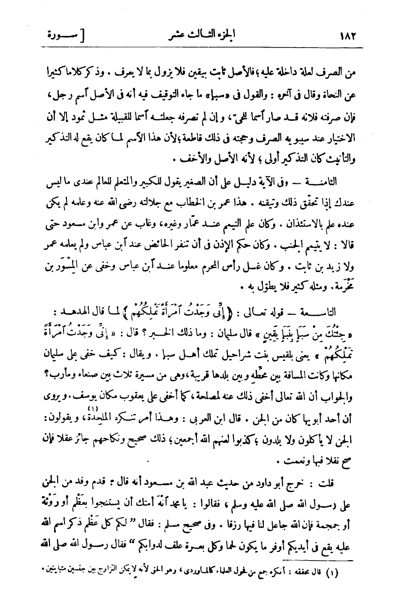 اسْمًا لِلْحَيِّ، وَإِنْ لَمْ تَصْرِفْهُ جَعَلْتَهُ اسْمًا لِلْقَبِيلَةِ مِثْلَ ثَمُودَ إِلَّا أَنَّ الِاخْتِيَارَ عِنْدَ سِيبَوَيْهِ الصَّرْفُ وَحُجَّتُهُ فِي ذَلِكَ قَاطِعَةٌ، لِأَنَّ هَذَا الِاسْمَ لَمَّا كَانَ يَقَعُ لَهُ التَّذْكِيرُ وَالتَّأْنِيثُ كَانَ التَّذْكِيرُ أَوْلَى، لِأَنَّهُ الْأَصْلُ وَالْأَخَفُّ. الثَّامِنَةُ- وَفِي الْآيَةِ دَلِيلٌ عَلَى أَنَّ الصَّغِيرَ يَقُولُ لِلْكَبِيرِ وَالْمُتَعَلِّمَ لِلْعَالِمِ عِنْدِي مَا لَيْسَ عِنْدَكَ إِذَا تَحَقَّقَ ذَلِكَ وَتَيَقَّنَهُ. هَذَا عُمَرُ بْنُ الْخَطَّابِ مَعَ جَلَالَتِهِ رَضِيَ اللَّهُ عَنْهُ وَعِلْمِهِ لَمْ يَكُنْ عِنْدَهُ عِلْمٌ بِالِاسْتِئْذَانِ. وَكَانَ عِلْمُ التَّيَمُّمِ عِنْدَ عَمَّارٍ وَغَيْرِهِ، وَغَابَ عَنْ عُمَرَ وَابْنِ مَسْعُودٍ حَتَّى قَالَا: لَا يَتَيَمَّمُ الْجُنُبُ. وَكَانَ حُكْمُ الْإِذْنِ فِي أَنْ تَنْفِرَ الْحَائِضُ عِنْدَ ابْنِ عَبَّاسٍ وَلَمْ يَعْلَمْهُ عُمَرُ وَلَا زَيْدُ بْنُ ثَابِتٍ. وَكَانَ غَسْلُ رَأْسِ الْمُحْرِمِ مَعْلُومًا عِنْدَ ابْنِ عَبَّاسٍ وَخَفِيَ عَنِ الْمِسْوَرِ بْنِ مَخْرَمَةَ. وَمِثْلُهُ كَثِيرٌ فَلَا يُطَوَّلُ بِهِ. التَّاسِعَةُ- قَوْلُهُ تَعَالَى: (إِنِّي وَجَدْتُ امْرَأَةً تَمْلِكُهُمْ) لَمَّا قَالَ الْهُدْهُدُ:" وَجِئْتُكَ مِنْ سَبَإٍ بِنَبَإٍ يَقِينٍ" قَالَ سُلَيْمَانُ: وَمَا ذَلِكَ الْخَبَرُ؟ قَالَ:" إِنِّي وَجَدْتُ امْرَأَةً تَمْلِكُهُمْ" يَعْنِي بِلْقِيسَ بِنْتَ شَرَاحِيلَ تَمْلِكُ أَهْلَ سَبَإٍ. وَيُقَالُ: كيف وخفى عَلَى سُلَيْمَانَ مَكَانُهَا وَكَانَتِ الْمَسَافَةُ بَيْنَ مَحَطِّهِ وَبَيْنَ بَلَدِهَا قَرِيبَةً، وَهِيَ مِنْ مَسِيرَةِ ثَلَاثٍ بَيْنَ صَنْعَاءَ وَمَأْرِبَ؟ وَالْجَوَابُ أَنَّ اللَّهَ تَعَالَى أَخْفَى ذَلِكَ عَنْهُ لِمَصْلَحَةٍ، كَمَا أَخْفَى عَلَى يَعْقُوبَ مَكَانَ يُوسُفَ. وَيُرْوَى أَنَّ أَحَدَ أَبَوَيْهَا كَانَ مِنَ الْجِنِّ. قَالَ ابْنُ الْعَرَبِيِّ: وَهَذَا أَمْرٌ تُنْكِرُهُ الْمُلْحِدَةُ، وَيَقُولُونَ: الْجِنُّ لَا يَأْكُلُونَ وَلَا يَلِدُونَ، كَذَبُوا لَعَنَهُمُ اللَّهُ أَجْمَعِينَ، ذَلِكَ صَحِيحٌ وَنِكَاحُهُمْ جَائِزٌ عَقْلًا فَإِنْ صَحَّ نَقْلًا فَبِهَا وَنِعْمَتْ. قُلْتُ: خَرَّجَ أَبُو دَاوُدَ مِنْ حَدِيثِ عَبْدِ اللَّهِ بْنِ مَسْعُودٍ أَنَّهُ قَالَ: قَدِمَ وَفْدٌ مِنَ الْجِنِّ عَلَى رَسُولِ اللَّهِ صَلَّى اللَّهُ عَلَيْهِ وَسَلَّمَ، فَقَالُوا: يَا مُحَمَّدُ انْهَ أُمَّتَكَ أَنْ يَسْتَنْجُوا بِعَظْمٍ أَوْ رَوْثَةٍ أَوْ جُمْجُمَةٍ فَإِنَّ اللَّهَ جَاعِلٌ لَنَا فِيهَا رِزْقًا. وَفِي صَحِيحِ مُسْلِمٍ فَقَالَ:" لَكُمْ كُلُّ عَظْمٍ ذُكِرَ اسْمُ اللَّهِ عَلَيْهِ يَقَعُ فِي أَيْدِيكُمْ أَوْفَرَ مَا يَكُونُ لَحْمًا وَكُلُّ بَعْرَةٍ عَلَفٌ لِدَوَابِّكُمْ" فَقَالَ رَسُولُ اللَّهِ صَلَّى اللَّهُ