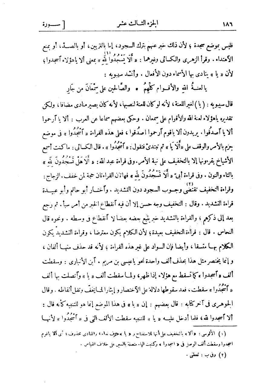 قَالَ سِيبَوَيْهِ:" يَا" لِغَيْرِ اللَّعْنَةِ، لِأَنَّهُ لَوْ كَانَ لِلَّعْنَةِ لَنَصَبَهَا، لِأَنَّهُ كَانَ يَصِيرُ مُنَادًى مُضَافًا، وَلَكِنَّ تَقْدِيرَهُ يَا هَؤُلَاءِ لَعْنَةُ اللَّهِ وَالْأَقْوَامِ عَلَى سَمْعَانَ. وَحَكَى بَعْضُهُمْ سَمَاعًا عَنِ الْعَرَبِ: أَلَا يَا ارْحَمُوا أَلَا يَا اصْدُقُوا. يُرِيدُونَ أَلَا يَا قَوْمٌ ارْحَمُوا اصْدُقُوا، فَعَلَى هَذِهِ الْقِرَاءَةِ" اسْجُدُوا" فِي مَوْضِعِ جَزْمٍ بِالْأَمْرِ وَالْوَقْفِ عَلَى" أَلَا يَا" ثُمَّ تَبْتَدِئُ فَتَقُولُ:" اسْجُدُوا". قَالَ الْكِسَائِيُّ: مَا كُنْتُ أَسْمَعُ الْأَشْيَاخَ يَقْرَءُونَهَا إِلَّا بِالتَّخْفِيفِ عَلَى نِيَّةِ الْأَمْرِ. وَفِي قِرَاءَةِ عَبْدِ اللَّهِ:" أَلَا هَلْ تَسْجُدُونَ لِلَّهِ" بِالتَّاءِ وَالنُّونِ. وَفِي قِرَاءَةِ أُبَيٍّ" أَلَا تَسْجُدُونَ لِلَّهِ" فَهَاتَانِ الْقِرَاءَتَانِ حُجَّةٌ لِمَنْ خَفَّفَ. الزَّجَّاجُ: وَقِرَاءَةُ التَّخْفِيفِ تَقْتَضِي وُجُوبَ السُّجُودِ دُونَ التَّشْدِيدِ. وَاخْتَارَ أَبُو حَاتِمٍ وَأَبُو عُبَيْدَةَ قِرَاءَةَ التَّشْدِيدِ. وَقَالَ: التَّخْفِيفُ وَجْهٌ حَسَنٌ إِلَّا أَنَّ فِيهِ انْقِطَاعَ الْخَبَرِ مِنْ أَمْرِ سَبَأٍ، ثُمَّ رَجَعَ بَعْدُ إِلَى ذِكْرِهِمْ، وَالْقِرَاءَةُ بِالتَّشْدِيدِ خَبَرٌ يَتْبَعُ بَعْضُهُ بَعْضًا لَا انْقِطَاعَ فِي وَسَطِهِ. وَنَحْوَهُ قَالَ النَّحَّاسُ. قَالَ: قِرَاءَةُ التَّخْفِيفِ بَعِيدَةٌ، لِأَنَّ الْكَلَامَ يَكُونُ مُعْتَرَضًا، وَقِرَاءَةُ التَّشْدِيدِ يَكُونُ الْكَلَامُ بِهَا مُتَّسِقًا، وَأَيْضًا فَإِنَّ السَّوَادَ عَلَى غَيْرِ هَذِهِ الْقِرَاءَةِ، لِأَنَّهُ قَدْ حُذِفَ مِنْهُ أَلِفَانِ، وَإِنَّمَا يُخْتَصَرُ مِثْلُ هَذَا بِحَذْفِ أَلِفٍ وَاحِدَةٍ نَحْوَ يَا عيسى بن مَرْيَمَ. ابْنُ الْأَنْبَارِيِّ: وَسَقَطَتْ أَلِفُ" اسْجُدُوا" كَمَا تَسْقُطُ مَعَ هَؤُلَاءِ إِذَا ظَهَرَ، وَلَمَّا سَقَطَتْ أَلِفُ" يَا" وَاتَّصَلَتْ بِهَا أَلِفُ" اسْجُدُوا" سَقَطَتْ، فَعُدَّ سُقُوطُهَا دَلَالَةً عَلَى الِاخْتِصَارِ وَإِيثَارًا لِمَا يَخِفُّ وَتَقِلُّ أَلْفَاظُهُ. وَقَالَ الْجَوْهَرِيُّ فِي آخِرِ كِتَابِهِ: قَالَ بَعْضُهُمْ: إِنَّ" يَا" فِي هَذَا الْمَوْضِعِ إِنَّمَا هُوَ لِلتَّنْبِيهِ كَأَنَّهُ قَالَ: أَلَا اسْجُدُوا لِلَّهِ، فَلَمَّا أُدْخِلَ عَلَيْهِ" يَا" لِلتَّنْبِيهِ سقطت الالف التي في" اسجدوا" لأنها