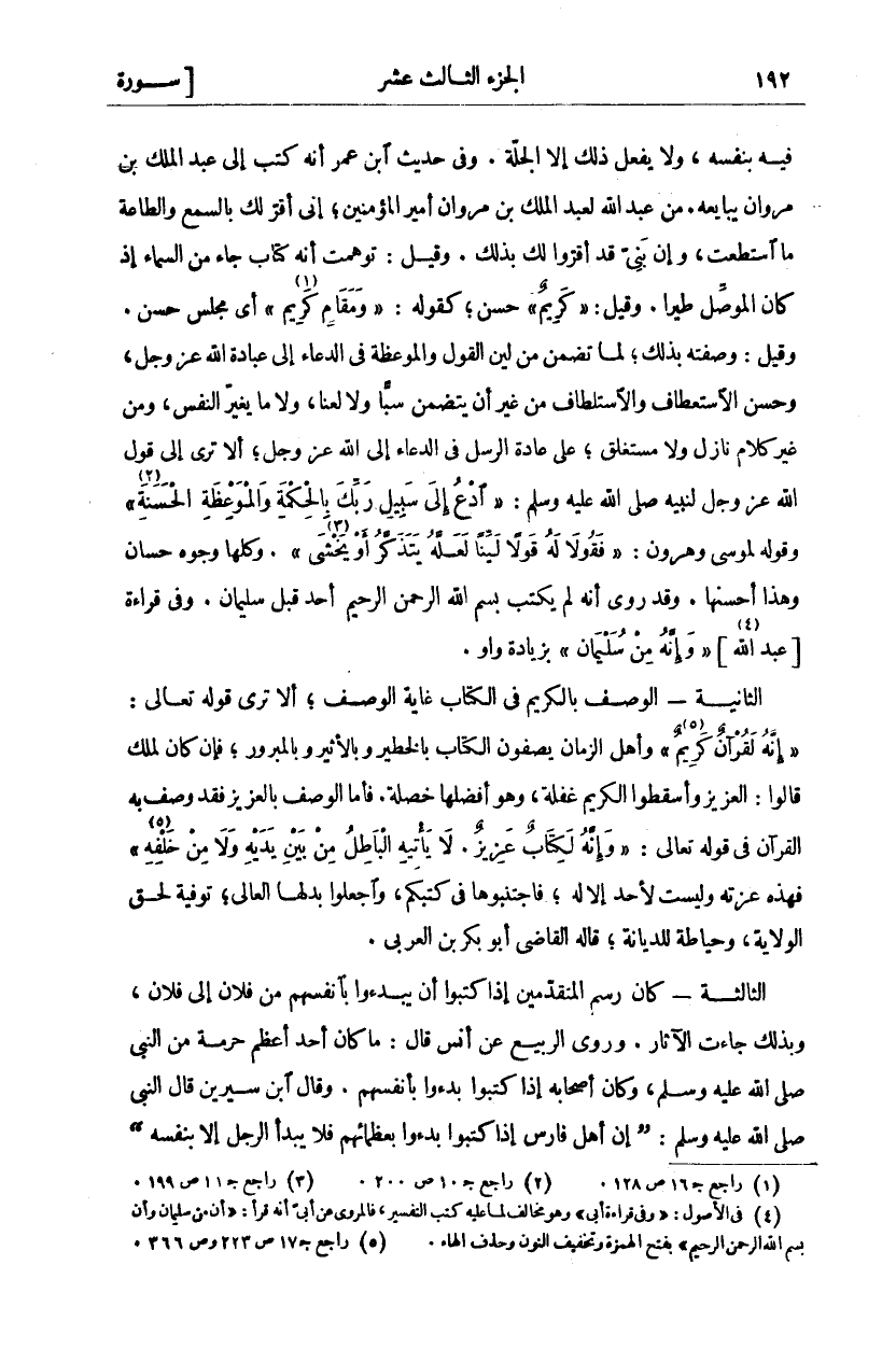 فِيهِ بِنَفْسِهِ، وَلَا يَفْعَلُ ذَلِكَ إِلَّا الْجُلَّةُ. وَفِي حَدِيثِ ابْنِ عُمَرَ أَنَّهُ كَتَبَ إِلَى عَبْدِ الْمَلِكِ بْنِ مَرْوَانَ يُبَايِعُهُ: مِنْ عَبْدِ اللَّهِ لِعَبْدِ الْمَلِكِ بْنِ مَرْوَانَ أَمِيرِ الْمُؤْمِنِينَ، إِنِّي أُقِرُّ لَكَ بِالسَّمْعِ وَالطَّاعَةِ مَا اسْتَطَعْتُ، وَإِنَّ بَنِيَّ قَدْ أَقَرُّوا لَكَ بِذَلِكَ. وَقِيلَ: تَوَهَّمَتْ أَنَّهُ كِتَابٌ جَاءَ مِنَ السَّمَاءِ إِذْ كان الموصل طيرا. وقيل:" كَرِيمٌ" حسن، كقول:" وَمَقامٍ كَرِيمٍ" أَيْ مَجْلِسٍ حَسَنٍ. وَقِيلَ: وَصَفَتْهُ بِذَلِكَ، لِمَا تَضَمَّنَ مِنْ لِينِ الْقَوْلِ وَالْمَوْعِظَةِ فِي الدُّعَاءِ إِلَى عِبَادَةِ اللَّهِ عَزَّ وَجَلَّ، وَحُسْنِ الِاسْتِعْطَافِ وَالِاسْتِلْطَافِ مِنْ غَيْرِ أَنْ يَتَضَمَّنَ سَبًّا وَلَا لَعْنًا، وَلَا مَا يُغَيِّرُ النَّفْسَ، وَمِنْ غَيْرِ كَلَامٍ نَازِلٍ وَلَا مُسْتَغْلَقٍ، عَلَى عَادَةِ الرُّسُلِ فِي الدُّعَاءِ إِلَى اللَّهِ عَزَّ وَجَلَّ، أَلَا تَرَى إِلَى قَوْلِ اللَّهِ عَزَّ وَجَلَّ لِنَبِيِّهِ صَلَّى اللَّهُ عَلَيْهِ وَسَلَّمَ:" ادْعُ إِلى سَبِيلِ رَبِّكَ بِالْحِكْمَةِ وَالْمَوْعِظَةِ الْحَسَنَةِ" وَقَوْلُهُ لموسى وهرون:" فَقُولا لَهُ قَوْلًا لَيِّناً لَعَلَّهُ يَتَذَكَّرُ أَوْ يَخْشى ". وَكُلُّهَا وُجُوهٌ حِسَانٌ وَهَذَا أَحْسَنُهَا. وَقَدْ رُوِيَ أَنَّهُ لَمْ يَكْتُبْ بِسْمِ اللَّهِ الرَّحْمَنِ الرَّحِيمِ أَحَدٌ قَبْلَ سُلَيْمَانَ. وَفِي قِرَاءَةِ [عَبْدِ اللَّهِ «١»] " وَإِنَّهُ مِنْ سُلَيْمَانَ" بِزِيَادَةِ وَاوٍ. الثَّانِيَةُ- الْوَصْفُ بِالْكَرِيمِ فِي الْكِتَابِ غَايَةُ الْوَصْفِ، أَلَا تَرَى قَوْلَهُ تَعَالَى:" إِنَّهُ لَقُرْآنٌ كَرِيمٌ" وَأَهْلُ الزَّمَانِ يَصِفُونَ الْكِتَابَ بِالْخَطِيرِ وَبِالْأَثِيرِ وَبِالْمَبْرُورِ، فَإِنْ كَانَ لِمَلِكٍ قَالُوا: الْعَزِيزُ وَأَسْقَطُوا الْكَرِيمَ غَفْلَةً، وَهُوَ أَفْضَلُهَا خَصْلَةً. فَأَمَّا الْوَصْفُ بِالْعَزِيزِ فَقَدْ وُصِفَ بِهِ الْقُرْآنُ فِي قَوْلِهِ تَعَالَى:" وَإِنَّهُ لَكِتابٌ عَزِيزٌ. لَا يَأْتِيهِ الْباطِلُ مِنْ بَيْنِ يَدَيْهِ وَلا مِنْ خَلْفِهِ" فَهَذِهِ عِزَّتُهُ وَلَيْسَتْ لِأَحَدٍ إِلَّا لَهُ، فَاجْتَنِبُوهَا فِي كُتُبِكُمْ، وَاجْعَلُوا بَدَلَهَا الْعَالِي، تَوْفِيَةً لِحَقِ الْوِلَايَةِ، وَحِيَاطَةً لِلدِّيَانَةِ، قال الْقَاضِي أَبُو بَكْرِ بْنُ الْعَرَبِيِّ. الثَّالِثَةُ- كَانَ رَسْمُ الْمُتَقَدِّمِينَ إِذَا كَتَبُوا أَنْ يَبْدَءُوا بِأَنْفُسِهِمْ مِنْ فُلَانٍ إِلَى فُلَانٍ، وَبِذَلِكَ جَاءَتِ الْآثَارُ. وَرَوَى الرَّبِيعُ عَنْ أَنَسٍ قَالَ: مَا كَانَ أَحَدٌ أَعْظَمَ حُرْمَةً مِنَ النَّبِيِّ صَلَّى اللَّهُ عَلَيْهِ وَسَلَّمَ: وَكَانَ أَصْحَابُهُ إِذَا كَتَبُوا بَدَءُوا بِأَنْفُسِهِمْ. وَقَالَ ابْنُ سِيرِينَ قَالَ النَّبِيُّ صَلَّى اللَّهُ عَلَيْهِ وَسَلَّمَ:" إِنَّ أَهْلَ فَارِسَ إِذَا كَتَبُوا بَدَءُوا بِعُظَمَائِهِمْ فَلَا يَبْدَأِ الرَّجُلُ إِلَّا بنفسه"