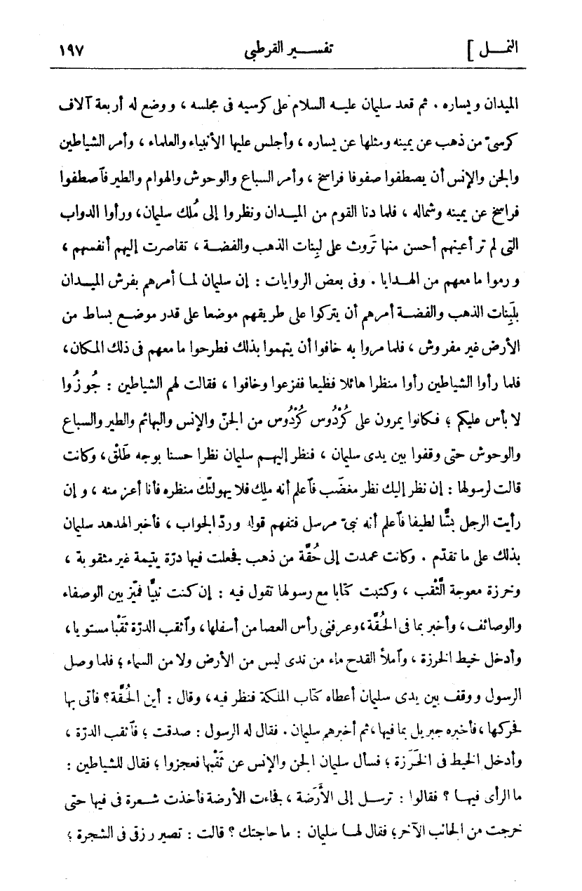 الْمَيْدَانِ وَيَسَارِهِ. ثُمَّ قَعَدَ سُلَيْمَانُ عَلَيْهِ السَّلَامُ عَلَى كُرْسِيِّهِ فِي مَجْلِسِهِ، وَوُضِعَ لَهُ أَرْبَعَةُ آلَافِ كُرْسِيٍّ مِنْ ذَهَبٍ عَنْ يَمِينِهِ وَمِثْلُهَا عَنْ يَسَارِهِ، وَأَجْلَسَ عَلَيْهَا الْأَنْبِيَاءَ وَالْعُلَمَاءَ، وَأَمَرَ الشَّيَاطِينَ وَالْجِنَّ وَالْإِنْسَ أَنْ يَصْطَفُّوا صُفُوفًا فَرَاسِخَ، وَأَمَرَ السِّبَاعَ وَالْوُحُوشَ وَالْهَوَامَّ وَالطَّيْرَ فَاصْطَفُّوا فَرَاسِخَ عَنْ يَمِينِهِ وَشِمَالِهِ، فَلَمَّا دَنَا الْقَوْمُ مِنَ الْمَيْدَانِ وَنَظَرُوا إِلَى مُلْكِ سُلَيْمَانَ، وَرَأَوُا الدَّوَابَّ الَّتِي لَمْ تَرَ أَعْيُنُهُمْ أَحْسَنَ مِنْهَا تَرُوثُ عَلَى لَبِنَاتِ الذَّهَبِ وَالْفِضَّةِ، تَقَاصَرَتْ إِلَيْهِمْ أَنْفُسُهُمْ، وَرَمَوْا مَا مَعَهُمْ مِنَ الْهَدَايَا. وَفِي بَعْضِ الرِّوَايَاتِ: إِنَّ سُلَيْمَانَ لَمَّا أَمَرَهُمْ بِفَرْشِ الْمَيْدَانِ بِلَبِنَاتِ الذَّهَبِ وَالْفِضَّةِ أَمَرَهُمْ أَنْ يَتْرُكُوا عَلَى طَرِيقِهِمْ مَوْضِعًا عَلَى قَدْرِ مَوْضِعِ بِسَاطٍ مِنَ الْأَرْضِ غَيْرَ مَفْرُوشٍ، فَلَمَّا مَرُّوا بِهِ خَافُوا أَنْ يُتَّهَمُوا بِذَلِكَ فَطَرَحُوا مَا مَعَهُمْ فِي ذَلِكَ الْمَكَانِ، فَلَمَّا رَأَوُا الشَّيَاطِينَ رَأَوْا مَنْظَرًا هَائِلًا فَظِيعًا فَفَزِعُوا وَخَافُوا، فَقَالَتْ لَهُمُ الشَّيَاطِينُ: جُوزُوا لَا بَأْسَ عَلَيْكُمْ، فَكَانُوا يَمُرُّونَ عَلَى كُرْدُوسٍ كُرْدُوسٍ مِنَ الْجِنِّ وَالْإِنْسِ وَالْبَهَائِمِ وَالطَّيْرِ وَالسِّبَاعِ وَالْوُحُوشِ حَتَّى وَقَفُوا بَيْنَ يَدَيْ سُلَيْمَانَ، فَنَظَرَ إِلَيْهِمْ سُلَيْمَانُ نَظَرًا حَسَنًا بِوَجْهٍ طَلْقٍ، وَكَانَتْ قَالَتْ لِرَسُولِهَا: إِنْ نَظَرَ إِلَيْكَ نَظَرَ مُغْضَبٍ فَاعْلَمْ أَنَّهُ مَلِكٌ فَلَا يَهُولَنَّكَ مَنْظَرُهُ فَأَنَا أَعَزُّ مِنْهُ، وَإِنْ رَأَيْتَ الرَّجُلَ بَشًّا لطيفا فاعلم أنه نبى مرسل فتفهم قول وَرُدَّ الْجَوَابَ، فَأَخْبَرَ الْهُدْهُدُ سُلَيْمَانَ بِذَلِكَ عَلَى مَا تَقَدَّمَ. وَكَانَتْ عَمَدَتْ إِلَى حُقَّةٍ مِنْ ذَهَبٍ فَجَعَلَتْ فِيهَا دُرَّةً يَتِيمَةً غَيْرَ مَثْقُوبَةٍ، وَخَرَزَةً مُعْوَجَّةَ الثَّقْبِ، وَكَتَبَتْ كِتَابًا مَعَ رَسُولِهَا تَقُولُ فِيهِ: إِنْ كُنْتَ نَبِيًّا فَمَيِّزْ بَيْنَ الْوُصَفَاءِ وَالْوَصَائِفِ، وَأَخْبِرْ بِمَا فِي الْحُقَّةِ، وَعَرِّفْنِي رَأْسَ الْعَصَا مِنْ أَسْفَلِهَا، وَاثْقُبِ الدُّرَّةَ ثَقْبًا مُسْتَوِيًا، وَأَدْخِلْ خَيْطَ الْخَرَزَةِ، وَامْلَأِ الْقَدَحَ مَاءً مِنْ نَدًى لَيْسَ مِنَ الْأَرْضِ وَلَا مِنَ السَّمَاءِ، فَلَمَّا وَصَلَ الرَّسُولُ وَوَقَفَ بَيْنَ يَدَيْ سُلَيْمَانَ أَعْطَاهُ كِتَابَ الْمَلِكَةِ فَنَظَرَ فِيهِ، وَقَالَ: أَيْنَ الْحُقَّةُ؟ فَأَتَى بِهَا فَحَرَّكَهَا، فَأَخْبَرَهُ جِبْرِيلُ بِمَا فِيهَا، ثُمَّ أَخْبَرَهُمْ سُلَيْمَانُ. فَقَالَ لَهُ الرَّسُولُ: صَدَقْتَ، فَاثْقُبِ الدُّرَّةَ، وَأَدْخِلِ الْخَيْطَ فِي الْخَرَزَةِ، فَسَأَلَ سُلَيْمَانُ الْجِنَّ وَالْإِنْسَ عَنْ ثَقْبِهَا فَعَجَزُوا، فَقَالَ لِلشَّيَاطِينِ: مَا الرَّأْيُ فِيهَا؟ فَقَالُوا: تُرْسِلُ إِلَى الْأَرَضَةِ، فَجَاءَتِ الْأَرَضَةُ فَأَخَذَتْ شَعْرَةً فِي فِيهَا حَتَّى خَرَجَتْ مِنَ الْجَانِبِ الْآخَرِ، فَقَالَ لَهَا سُلَيْمَانُ: مَا حَاجَتُكِ؟ قَالَتْ: تُصَيِّرُ رِزْقِي فِي الشَّجَرَةِ،