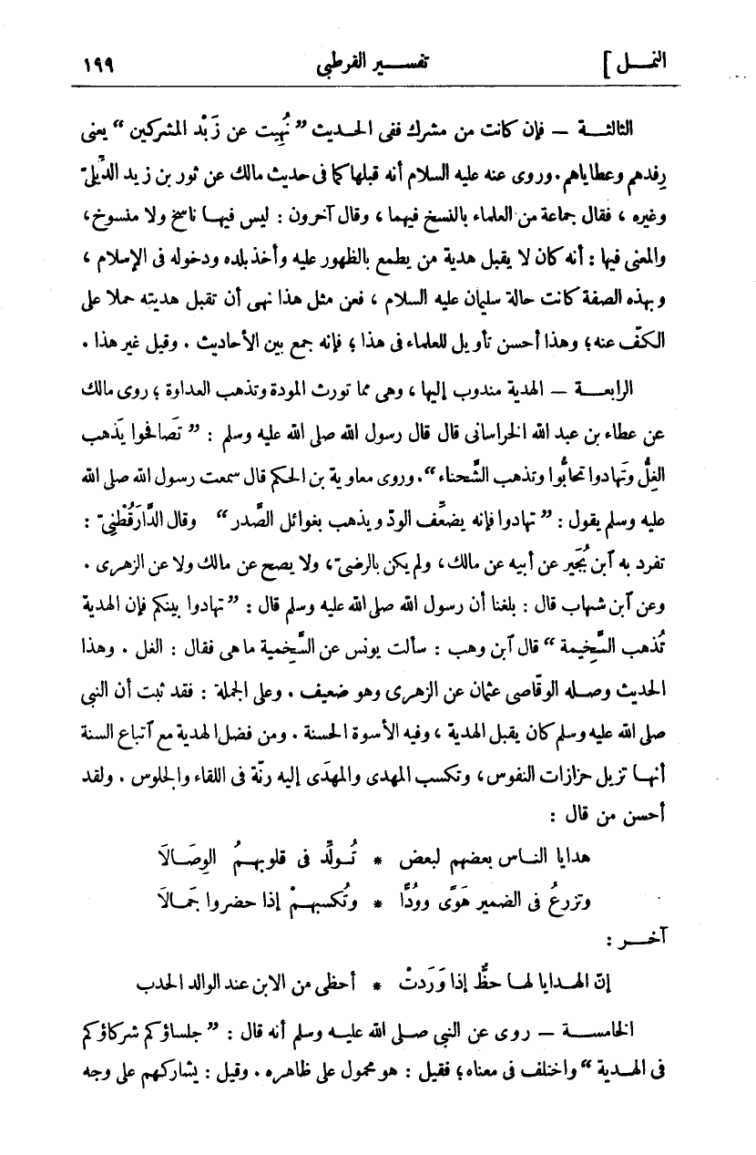 الثَّالِثَةُ- فَإِنْ كَانَتْ مِنْ مُشْرِكٍ فَفِي الْحَدِيثِ" نُهِيتُ عَنْ زَبْدِ الْمُشْرِكِينَ" يَعْنِي رِفْدَهُمْ وَعَطَايَاهُمْ. وَرُوِيَ عَنْهُ عَلَيْهِ السَّلَامُ أَنَّهُ قَبِلَهَا كَمَا فِي حَدِيثِ مَالِكٍ عَنْ ثَوْرِ بْنِ زَيْدٍ الدِّبْلِيِّ وَغَيْرِهِ، فَقَالَ جَمَاعَةٌ مِنَ الْعُلَمَاءِ بِالنَّسْخِ فِيهِمَا، وَقَالَ آخَرُونَ: لَيْسَ فِيهَا نَاسِخٌ وَلَا مَنْسُوخٌ، وَالْمَعْنَى فِيهَا: أَنَّهُ كَانَ لَا يَقْبَلُ هَدِيَّةَ مَنْ يَطْمَعُ بِالظُّهُورِ عَلَيْهِ وَأَخْذِ بَلَدِهِ وَدُخُولِهِ فِي الْإِسْلَامِ، وَبِهَذِهِ الصِّفَةِ كَانَتْ حَالَةُ سُلَيْمَانَ عَلَيْهِ السَّلَامُ، فَعَنْ مِثْلِ هَذَا نَهَى أَنْ تُقْبَلَ هَدِيَّتُهُ حَمْلًا عَلَى الْكَفِّ عَنْهُ، وَهَذَا أَحْسَنُ تَأْوِيلٍ لِلْعُلَمَاءِ فِي هَذَا، فَإِنَّهُ جَمْعٌ بَيْنَ الْأَحَادِيثِ. وَقِيلَ غَيْرُ هَذَا. الرَّابِعَةُ- الْهَدِيَّةُ مَنْدُوبٌ إِلَيْهَا، وَهِيَ مِمَّا تُورِثُ الْمَوَدَّةَ وَتُذْهِبُ الْعَدَاوَةَ، رَوَى مَالِكٌ عَنْ عَطَاءِ بْنِ عَبْدِ اللَّهِ الْخُرَاسَانِيِّ قَالَ قَالَ رَسُولُ اللَّهِ صَلَّى اللَّهُ عَلَيْهِ وَسَلَّمَ:" تَصَافَحُوا يَذْهَبُ الْغِلُّ وَتَهَادُوا تَحَابُّوا وَتَذْهَبُ الشَّحْنَاءُ". وَرَوَى مُعَاوِيَةُ بْنُ الْحَكَمِ قَالَ: سَمِعْتُ رَسُولَ اللَّهِ صَلَّى اللَّهُ عَلَيْهِ وَسَلَّمَ يَقُولُ:" تَهَادُوا فَإِنَّهُ يُضَعِّفُ الْوُدَّ وَيَذْهَبُ بِغَوَائِلِ الصَّدْرِ". وَقَالَ الدَّارَقُطْنِيُّ: تَفَرَّدَ بِهِ ابْنُ بُجَيْرٍ عَنْ أَبِيهِ عَنْ مَالِكٍ، وَلَمْ يَكُنْ بِالرَّضِيِّ، وَلَا يَصِحُّ عَنْ مَالِكٍ وَلَا عَنِ الزُّهْرِيِّ. وَعَنِ ابْنِ شِهَابٍ قَالَ: بَلَغَنَا أَنَّ رَسُولَ اللَّهِ صَلَّى اللَّهُ عَلَيْهِ وَسَلَّمَ قَالَ:" تَهَادُوا بَيْنَكُمْ فَإِنَّ الْهَدِيَّةَ تُذْهِبُ السَّخِيمَةَ" قَالَ ابْنُ وَهْبٍ: سَأَلْتُ يُونُسَ عَنِ السَّخِيمَةِ مَا هِيَ فَقَالَ: الْغِلُّ. وَهَذَا الْحَدِيثُ وَصَلَهُ الْوَقَّاصِيُّ عُثْمَانُ عَنِ الزُّهْرِيِّ وَهُوَ ضَعِيفٌ. وَعَلَى الْجُمْلَةِ: فَقَدْ ثَبَتَ أَنَّ النَّبِيَّ صَلَّى اللَّهُ عَلَيْهِ وَسَلَّمَ كَانَ يَقْبَلُ الْهَدِيَّةَ، وَفِيهِ الْأُسْوَةُ الْحَسَنَةُ. وَمِنْ فَضْلِ الْهَدِيَّةِ مَعَ اتِّبَاعِ السُّنَّةِ أَنَّهَا تُزِيلُ حَزَازَاتِ النُّفُوسِ، وَتُكْسِبُ الْمُهْدِيَ وَالْمُهْدَى إِلَيْهِ رَنَّةً فِي اللِّقَاءِ وَالْجُلُوسِ. وَلَقَدْ أَحْسَنَ مَنْ قَالَ: