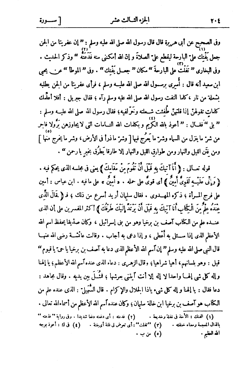 وَفِي الصَّحِيحُ عَنْ أَبِي هُرَيْرَةَ قَالَ قَالَ رَسُولُ اللَّهِ صَلَّى اللَّهُ عَلَيْهِ وَسَلَّمَ:" إن عِفْرِيتًا مِنَ الْجِنِّ جَعَلَ يَفْتِكُ «١» عَلَيَّ الْبَارِحَةَ لِيَقْطَعَ عَلَيَّ الصَّلَاةَ وَإِنَّ اللَّهَ أَمْكَنَنِي مِنْهُ فدعته «٢» " وَذَكَرَ الْحَدِيثَ. وَفِي الْبُخَارِيِّ" تَفَلَّتَ «٣» عَلَيَّ الْبَارِحَةَ" مَكَانَ" جَعَلَ يَفْتِكُ". وَفِي الْمُوَطَّأِ عَنْ يَحْيَى ابن سَعِيدٍ أَنَّهُ قَالَ: أُسْرِيَ بِرَسُولِ اللَّهِ صَلَّى اللَّهُ عَلَيْهِ وَسَلَّمَ، فَرَأَى عِفْرِيتًا مِنَ الْجِنِّ يَطْلُبُهُ بِشُعْلَةٍ مِنْ نَارٍ، كُلَّمَا الْتَفَتَ رَسُولَ اللَّهِ صَلَّى اللَّهُ عَلَيْهِ وَسَلَّمَ رَآهُ، فَقَالَ جِبْرِيلُ: أَفَلَا أُعَلِّمُكَ كَلِمَاتٍ تَقُولُهُنَّ إِذَا قُلْتَهُنَّ طُفِئَتْ شُعْلَتُهُ وَخَرَّ لِفِيهِ، فَقَالَ رَسُولُ اللَّهِ صَلَّى اللَّهُ عَلَيْهِ وَسَلَّمَ:" بَلَى" فَقَالَ:" أَعُوذُ بِاللَّهِ الْكَرِيمِ «٤» وَبِكَلِمَاتِ اللَّهِ التَّامَّاتِ الَّتِي لَا يُجَاوِزُهُنَّ بَرٌّ وَلَا فَاجِرٌ مِنْ شَرِّ مَا يَنْزِلُ مِنَ السَّمَاءِ وَشَرِّ مَا يَعْرُجُ فِيهَا [وَشَرِّ مَا ذَرَأَ فِي الْأَرْضِ، وَشَرِّ مَا يَخْرُجُ مِنْهَا «٥»] وَمِنْ فِتَنِ اللَّيْلِ وَالنَّهَارِ وَمِنْ طَوَارِقِ اللَّيْلِ وَالنَّهَارِ إِلَّا طَارِقًا يَطْرُقُ بِخَيْرٍ يا رحمان". قَوْلُهُ تَعَالَى: (أَنَا آتِيكَ بِهِ قَبْلَ أَنْ تَقُومَ مِنْ مَقامِكَ) يَعْنِي فِي مَجْلِسِهِ الَّذِي يَحْكُمُ فِيهِ. (وَإِنِّي عَلَيْهِ لَقَوِيٌّ أَمِينٌ) أَيْ قَوِيٌّ عَلَى حَمْلِهِ." أَمِينٌ" عَلَى مَا فِيهِ. ابْنُ عَبَّاسٍ: أَمِينٌ عَلَى فَرْجِ الْمَرْأَةِ، ذَكَرَهُ الْمَهْدَوِيُّ. فَقَالَ سُلَيْمَانُ أُرِيدُ أَسْرَعَ مِنْ ذَلِكَ، فَ (- قالَ الَّذِي عِنْدَهُ عِلْمٌ مِنَ الْكِتابِ أَنَا آتِيكَ بِهِ قَبْلَ أَنْ يَرْتَدَّ إِلَيْكَ طَرْفُكَ) أَكْثَرُ الْمُفَسِّرِينَ عَلَى أَنَّ الَّذِي عِنْدَهُ عِلْمٌ مِنَ الْكِتَابِ آصَفُ بْنُ بَرْخِيَا وَهُوَ مِنْ بَنِي إِسْرَائِيلَ، وَكَانَ صِدِّيقًا يَحْفَظُ اسْمُ اللَّهِ الْأَعْظَمِ الَّذِي إِذَا سُئِلَ بِهِ أَعْطَى، وَإِذَا دُعِيَ بِهِ أَجَابَ. وَقَالَتْ عَائِشَةُ رَضِيَ اللَّهُ عَنْهَا قَالَ النَّبِيُّ صَلَّى اللَّهُ عَلَيْهِ وَسَلَّمَ" إِنَّ اسْمَ اللَّهِ الْأَعْظَمَ الَّذِي دَعَا بِهِ آصَفُ بْنُ بَرْخِيَا يَا حَيُّ يَا قَيُّومُ" قِيلَ: وَهُوَ بِلِسَانِهِمْ، أَهَيَا شَرَاهِيَا، وَقَالَ الزُّهْرِيُّ: دُعَاءُ الَّذِي عِنْدَهُ اسْمُ اللَّهِ الْأَعْظَمُ، يا إلهنا واله كل شي إِلَهًا وَاحِدًا لَا إِلَهَ إِلَّا أَنْتَ ايتِنِي بِعَرْشِهَا، فَمَثَلَ بَيْنَ يَدَيْهِ. وَقَالَ مُجَاهِدٌ: دَعَا فقال: يا إلهنا واله كل شي يَا ذَا الْجَلَالِ وَالْإِكْرَامِ. قَالَ السُّهَيْلِيُّ: الَّذِي عنده علم من الكتاب هو آصف ابن بَرْخِيَا ابْنُ خَالَةِ سُلَيْمَانَ، وَكَانَ عِنْدَهُ اسْمُ الله الأعظم من أسماء الله تعالى.