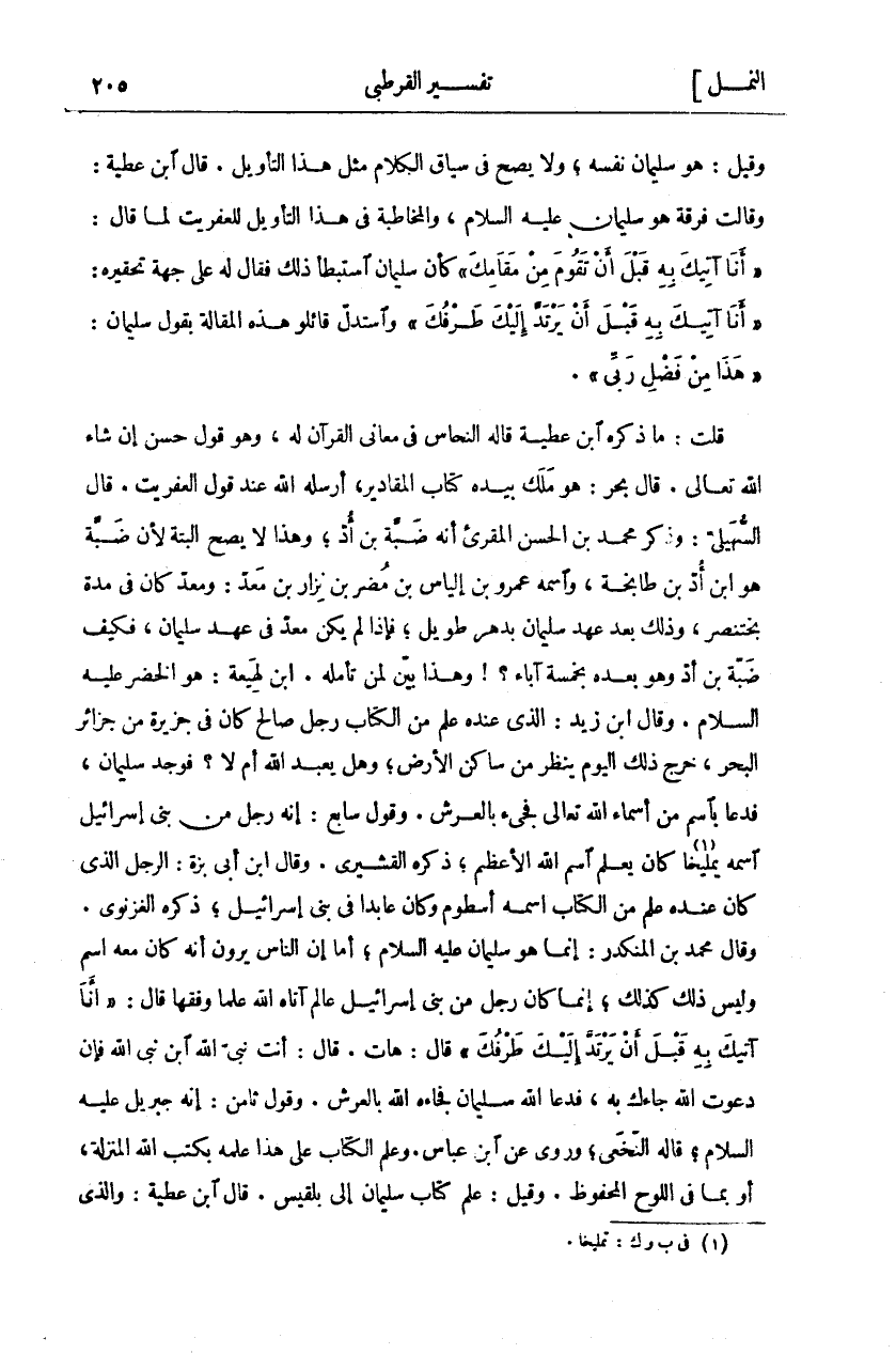وَقِيلَ: هُوَ سُلَيْمَانُ نَفْسُهُ، وَلَا يَصِحُّ فِي سِيَاقِ الْكَلَامِ مِثْلُ هَذَا التَّأْوِيلِ. قَالَ ابْنُ عَطِيَّةَ: وَقَالَتْ فِرْقَةٌ هُوَ سُلَيْمَانُ عَلَيْهِ السَّلَامُ، وَالْمُخَاطَبَةُ فِي هَذَا التَّأْوِيلِ لِلْعِفْرِيتِ لَمَّا قَالَ:" أَنَا آتِيكَ بِهِ قَبْلَ أَنْ تَقُومَ مِنْ مَقامِكَ" كَأَنَّ سُلَيْمَانَ اسْتَبْطَأَ ذَلِكَ فَقَالَ لَهُ عَلَى جِهَةِ تَحْقِيرِهِ:" أَنَا آتِيكَ بِهِ قَبْلَ أَنْ يَرْتَدَّ إِلَيْكَ طَرْفُكَ" وَاسْتَدَلَّ قَائِلُو هَذِهِ الْمَقَالَةِ بِقَوْلِ سُلَيْمَانَ:" هَذَا مِنْ فَضْلِ رَبِّي". قُلْتُ: مَا ذَكَرَهُ ابْنُ عَطِيَّةَ قَالَهُ النَّحَّاسُ فِي مَعَانِي الْقُرْآنِ لَهُ، وَهُوَ قَوْلٌ حَسَنٌ إِنْ شَاءَ اللَّهُ تَعَالَى. قَالَ بَحْرٌ: هُوَ مَلَكٌ بِيَدِهِ كِتَابُ الْمَقَادِيرِ، أَرْسَلَهُ اللَّهُ عِنْدَ قَوْلِ الْعِفْرِيتِ. قَالَ السُّهَيْلِيُّ: وَذَكَرَ مُحَمَّدُ بْنُ الْحَسَنِ الْمُقْرِئُ أَنَّهُ ضَبَّةُ بْنُ أُدٍّ، وَهَذَا لَا يَصِحُّ الْبَتَّةَ لِأَنَّ ضَبَّةَ هُوَ ابْنُ أُدِّ بْنِ طَابِخَةَ، وَاسْمُهُ عَمْرُو بْنُ إِلْيَاسَ بْنِ مُضَرَ بْنِ نِزَارِ بْنِ مَعْدٍ، وَمَعْدٌ كان في مدة بخت نصر، وَذَلِكَ بَعْدَ عَهْدِ سُلَيْمَانَ بِدَهْرٍ طَوِيلٍ، فَإِذَا لَمْ يَكُنْ مَعْدٌ فِي عَهْدِ سُلَيْمَانَ، فَكَيْفَ ضَبَّةُ بْنُ أُدٍّ وَهُوَ بَعْدَهُ بِخَمْسَةِ آبَاءٍ؟! وَهَذَا بَيِّنٌ لِمَنْ تَأَمَّلَهُ. ابْنُ لَهِيعَةَ: هُوَ الْخَضِرُ عَلَيْهِ السَّلَامُ. وَقَالَ ابْنُ زَيْدٍ: الَّذِي عِنْدَهُ عِلْمٌ مِنَ الْكِتَابِ رَجُلٌ صَالِحٌ كَانَ في جزيرة من جزائر الْبَحْرِ، خَرَجَ ذَلِكَ الْيَوْمَ يَنْظُرُ مَنْ سَاكِنُ الْأَرْضِ؟ وَهَلْ يُعْبَدُ اللَّهُ أَمْ لَا؟ فَوَجَدَ سُلَيْمَانَ، فَدَعَا بِاسْمٍ مِنْ أَسْمَاءِ اللَّهِ تَعَالَى فجئ بِالْعَرْشِ. وَقَوْلٌ سَابِعٌ: أَنَّهُ رَجُلٌ مِنْ بَنِي إِسْرَائِيلَ اسْمُهُ يَمْلِيخَا كَانَ يَعْلَمُ اسْمَ اللَّهِ الْأَعْظَمِ، ذَكَرَهُ الْقُشَيْرِيُّ. وَقَالَ ابْنُ أَبِي بَزَّةَ: الرَّجُلُ الَّذِي كَانَ عِنْدَهُ عِلْمٌ مِنَ الْكِتَابِ اسْمُهُ أَسْطُومُ وَكَانَ عَابِدًا فِي بَنِي إِسْرَائِيلَ، ذَكَرَهُ الْغَزْنَوِيُّ. وَقَالَ مُحَمَّدُ بْنُ الْمُنْكَدِرِ: إِنَّمَا هُوَ سُلَيْمَانُ عَلَيْهِ السَّلَامُ، أَمَا إِنَّ النَّاسَ يَرَوْنَ أَنَّهُ كَانَ مَعَهُ اسْمٌ وَلَيْسَ ذَلِكَ كَذَلِكَ، إِنَّمَا كَانَ رَجُلٌ مِنْ بَنِي إِسْرَائِيلَ عالم آتَاهُ اللَّهُ عِلْمًا وَفِقْهًا قَالَ:" أَنَا آتِيكَ بِهِ قَبْلَ أَنْ يَرْتَدَّ إِلَيْكَ طَرْفُكَ" قَالَ: هَاتِ. قَالَ: أَنْتَ نَبِيُّ اللَّهِ ابْنُ نَبِيِّ اللَّهِ فَإِنْ دَعَوْتَ اللَّهَ جَاءَكَ بِهِ، فَدَعَا اللَّهَ سُلَيْمَانُ فَجَاءَهُ اللَّهُ بِالْعَرْشِ. وَقَوْلٌ ثَامِنٌ: إِنَّهُ جِبْرِيلُ عَلَيْهِ السَّلَامُ، قَالَهُ النَّخَعِيُّ، وَرُوِيَ عن ابن عباس. وعلم الْكِتَابِ عَلَى هَذَا عِلْمُهُ بِكُتُبِ اللَّهِ الْمُنَزَّلَةِ، أَوْ بِمَا فِي اللَّوْحِ الْمَحْفُوظِ. وَقِيلَ: عِلْمُ كِتَابِ سُلَيْمَانَ إِلَى بِلْقِيسَ. قَالَ ابْنُ عَطِيَّةَ: والذي