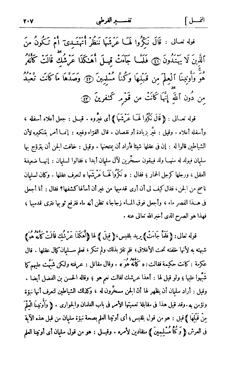 قَوْلُهُ تَعَالَى: (قالَ نَكِّرُوا لَها عَرْشَها) أَيْ غَيِّرُوهُ. قِيلَ: جَعَلَ أَعْلَاهُ أَسْفَلَهُ، وَأَسْفَلَهُ أَعْلَاهُ. وَقِيلَ: غُيِّرَ بِزِيَادَةٍ أَوْ نُقْصَانٍ. قَالَ الْفَرَّاءُ وَغَيْرُهُ: إِنَّمَا أَمَرَ بِتَنْكِيرِهِ لِأَنَّ الشَّيَاطِينَ قَالُوا لَهُ: إِنَّ فِي عَقْلِهَا شَيْئًا فَأَرَادَ أَنْ يَمْتَحِنَهَا. وَقِيلَ: خَافَتِ الْجِنُّ أَنْ يَتَزَوَّجَ بِهَا سُلَيْمَانُ فَيُولَدُ لَهُ مِنْهَا وَلَدٌ فَيَبْقَوْنَ مُسَخَّرِينَ لِآلِ سُلَيْمَانَ أَبَدًا، فَقَالُوا لِسُلَيْمَانَ: إِنَّهَا ضَعِيفَةُ الْعَقْلِ، وَرِجْلُهَا كَرِجْلِ الْحِمَارِ، فَقَالَ:" نَكِّرُوا لَها عَرْشَها" لِنَعْرِفَ عَقْلَهَا. وَكَانَ لِسُلَيْمَانَ نَاصِحٌ مِنَ الْجِنِّ، فَقَالَ كَيْفَ لِي أَنْ أَرَى قَدَمَيْهَا مِنْ غَيْرِ أَنْ أَسْأَلَهَا كَشْفَهَا؟ فَقَالَ: أَنَا أَجْعَلُ فِي هَذَا الْقَصْرِ مَاءً، وَأَجْعَلُ فَوْقَ الْمَاءِ زُجَاجًا، تَظُنُّ أَنَّهُ مَاءٌ فَتَرْفَعُ ثَوْبَهَا فَتَرَى قَدَمَيْهَا، فَهَذَا هُوَ الصَّرْحُ الَّذِي أَخْبَرَ اللَّهُ تَعَالَى عَنْهُ. قَوْلُهُ تعالى: (فَلَمَّا جاءَتْ) يريد بلقيس، (قِيلَ) لها (أَهكَذا عَرْشُكِ قالَتْ كَأَنَّهُ هُوَ) شَبَّهَتْهُ بِهِ لِأَنَّهَا خَلَّفَتْهُ تَحْتَ الْأَغْلَاقِ، فَلَمْ تُقِرَّ بِذَلِكَ وَلَمْ تُنْكِرْ، فَعَلِمَ سُلَيْمَانُ كَمَالَ عَقْلِهَا. قَالَ عِكْرِمَةُ: كَانَتْ حَكِيمَةً فَقَالَتْ:" كَأَنَّهُ هُوَ". وَقَالَ مُقَاتِلٌ: عَرَفَتْهُ وَلَكِنْ شَبَّهَتْ عَلَيْهِمْ كَمَا شَبَّهُوا عَلَيْهَا، وَلَوْ قِيلَ لَهَا: أَهَذَا عَرْشُكِ لَقَالَتْ نَعَمْ هُوَ، وَقَالَهُ الْحَسَنُ بْنُ الْفَضْلِ أَيْضًا. وَقِيلَ: أَرَادَ سُلَيْمَانُ أَنْ يُظْهِرَ لَهَا أَنَّ الْجِنَّ مُسَخَّرُونَ لَهُ، وَكَذَلِكَ الشَّيَاطِينَ لِتَعْرِفَ أَنَّهَا نُبُوَّةٌ وَتُؤْمِنَ بِهِ. وَقَدْ قِيلَ هَذَا فِي مُقَابَلَةِ تَعْمِيَتِهَا الْأَمْرَ فِي بَابِ الْغِلْمَانِ وَالْجَوَارِي. (وَأُوتِينَا الْعِلْمَ مِنْ قَبْلِها) قِيلَ: هُوَ مِنْ قَوْلِ بِلْقِيسَ، أَيْ أُوتِينَا الْعِلْمَ بِصِحَّةِ نُبُوَّةِ سُلَيْمَانَ مِنْ قَبْلِ هَذِهِ الْآيَةِ فِي الْعَرْشِ (وَكُنَّا مُسْلِمِينَ) مُنْقَادِينَ لِأَمْرِهِ. وَقِيلَ: هُوَ مِنْ قَوْلِ سُلَيْمَانَ أَيْ أُوتِينَا الْعِلْمَ