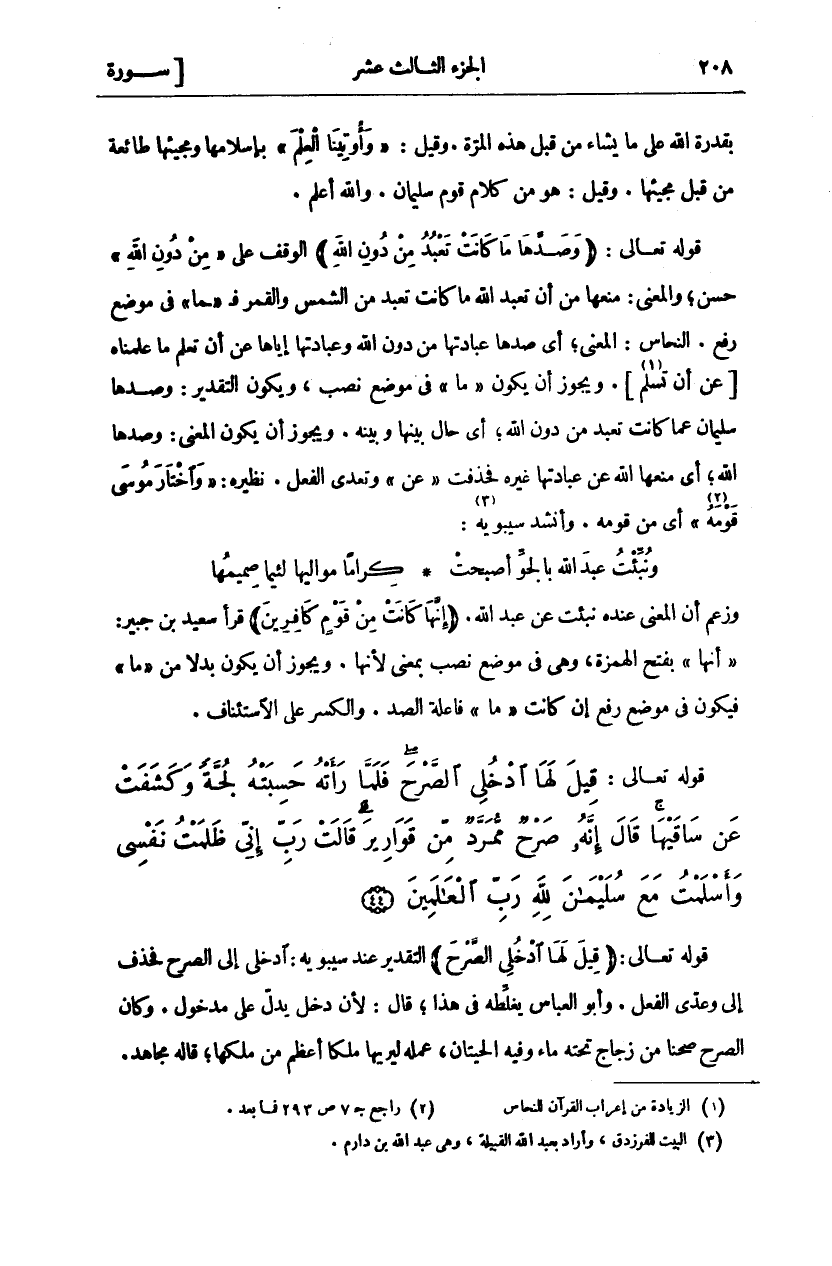 بِقُدْرَةِ اللَّهِ عَلَى مَا يَشَاءُ مِنْ قَبْلِ هَذِهِ الْمَرَّةِ. وَقِيلَ:" وَأُوتِينَا الْعِلْمَ" بِإِسْلَامِهَا وَمَجِيئِهَا طَائِعَةً مِنْ قَبْلِ مَجِيئِهَا. وَقِيلَ: هُوَ مِنْ كَلَامِ قَوْمِ سُلَيْمَانَ. وَاللَّهُ أَعْلَمُ. قَوْلُهُ تَعَالَى: (وَصَدَّها مَا كانَتْ تَعْبُدُ مِنْ دُونِ اللَّهِ) الْوَقْفُ عَلَى" مِنْ دُونِ اللَّهِ" حَسَنٌ، وَالْمَعْنَى: مَنَعَهَا مِنْ أَنْ تَعْبُدَ اللَّهَ مَا كَانَتْ تَعْبُدُ مِنَ الشَّمْسِ وَالْقَمَرِ فَ" مَا" فِي مَوْضِعِ رَفْعٍ. النَّحَّاسُ: الْمَعْنَى، أَيْ صَدَّهَا عِبَادَتُهَا مِنْ دُونِ اللَّهِ وَعِبَادَتُهَا إِيَّاهَا عَنْ أَنْ تَعْلَمَ مَا عَلِمْنَاهُ [عَنْ أَنَّ تُسْلِمَ «١»]. وَيَجُوزُ أَنْ يَكُونَ" مَا" فِي مَوْضِعِ نَصْبٍ، وَيَكُونَ التَّقْدِيرُ: وَصَدَّهَا سُلَيْمَانُ عَمَّا كَانَتْ تَعْبُدُ مِنْ دُونِ اللَّهِ، أَيْ حَالَ بَيْنَهَا وَبَيْنَهُ. وَيَجُوزُ أَنْ يَكُونَ الْمَعْنَى: وَصَدَّهَا اللَّهُ، أَيْ مَنَعَهَا اللَّهُ عَنْ عِبَادَتِهَا غَيْرَهُ فَحُذِفَتْ" عَنْ" وَتَعَدَّى الْفِعْلُ. نَظِيرُهُ:" وَاخْتارَ مُوسى قَوْمَهُ" أَيْ مِنْ قومه. وأنشد سيبويه «٢»: