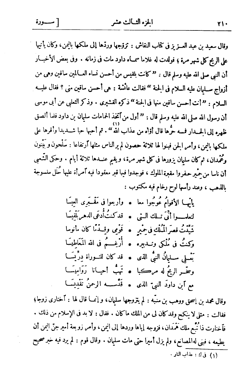 وَقَالَ سَعِيدُ بْنُ عَبْدِ الْعَزِيزِ فِي كِتَابِ النَّقَّاشِ: تَزَوَّجَهَا وَرَدَّهَا إِلَى مُلْكِهَا: بِالْيَمَنِ، وَكَانَ يَأْتِيهَا عَلَى الرِّيحِ كُلَّ شَهْرٍ مَرَّةً، فَوَلَدَتْ لَهُ غُلَامًا سَمَّاهُ دَاوُدَ مَاتَ فِي زَمَانِهِ. وَفِي بَعْضِ الْأَخْبَارِ أَنَّ النَّبِيَّ صَلَّى اللَّهُ عَلَيْهِ وَسَلَّمَ قَالَ:" كَانَتْ بِلْقِيسُ مِنْ أَحْسَنِ نِسَاءِ الْعَالَمِينَ سَاقَيْنِ وَهِيَ مِنْ أَزْوَاجِ سُلَيْمَانَ عَلَيْهِ السَّلَامُ فِي الْجَنَّةِ" فَقَالَتْ عَائِشَةُ: هِيَ أَحْسَنُ سَاقَيْنِ مِنِّي؟ فَقَالَ عَلَيْهِ السَّلَامَ:" أَنْتِ أَحْسَنُ سَاقَيْنِ مِنْهَا فِي الْجَنَّةِ" ذَكَرَهُ الْقُشَيْرِيُّ. وَذَكَرَ الثَّعْلَبِيُّ عَنْ أَبِي مُوسَى أَنَّ رَسُولَ اللَّهِ صَلَّى اللَّهُ عَلَيْهِ وَسَلَّمَ قَالَ:" أَوَّلُ مَنِ اتَّخَذَ الْحَمَّامَاتِ سُلَيْمَانُ بْنُ دَاوُدَ فَلَمَّا أَلْصَقَ ظَهْرَهُ إِلَى الْجِدَارِ فَمَسَّهُ حَرُّهَا قَالَ أَوَّاهُ مِنْ عَذَابِ اللَّهِ". ثُمَّ أَحَبَّهَا حُبًّا شَدِيدًا وَأَقَرَّهَا عَلَى مُلْكِهَا بِالْيَمَنِ، وَأَمَرَ الْجِنَّ فَبَنَوْا لَهَا ثَلَاثَةَ حُصُونٍ لَمْ يَرَ النَّاسُ مِثْلَهَا ارْتِفَاعًا: سَلْحُونَ وَبَيْنُونَ وَعُمْدَانَ، ثُمَّ كَانَ سُلَيْمَانُ يَزُورُهَا فِي كُلِّ شَهْرٍ مَرَّةً، وَيُقِيمُ عِنْدَهَا ثَلَاثَةَ أَيَّامٍ. وَحَكَى الشَّعْبِيُّ أَنَّ نَاسًا مِنْ حِمْيَرَ حَفَرُوا مَقْبَرَةَ الْمُلُوكِ، فَوَجَدُوا فِيهَا قبرا معقودا فيه امرأة حُلَلٌ مَنْسُوجَةٌ بِالذَّهَبِ، وَعِنْدَ رَأْسِهَا لَوْحُ رُخَامٍ فِيهِ مَكْتُوبٌ:
