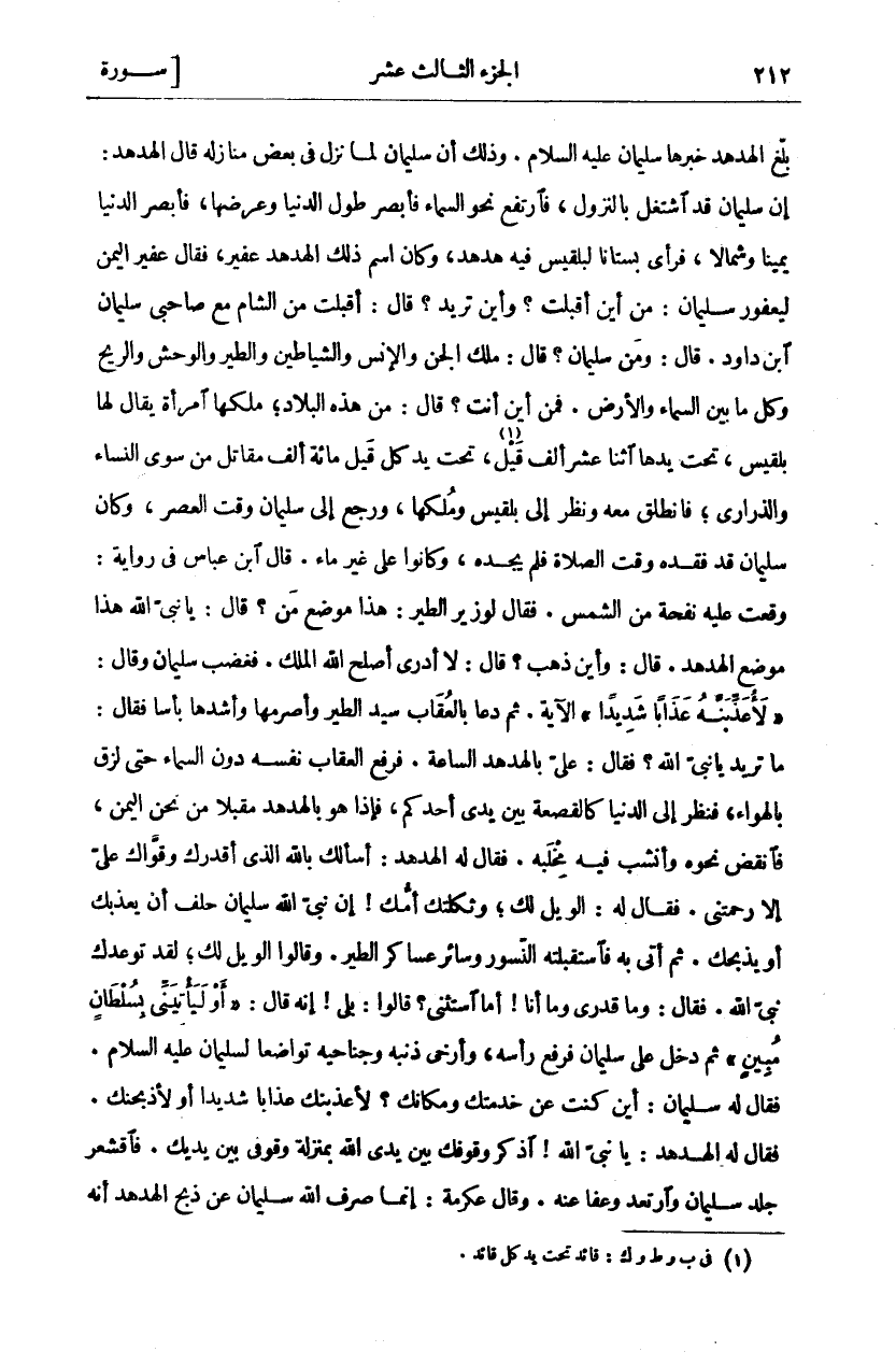 بَلَّغَ الْهُدْهُدُ خَبَرَهَا سُلَيْمَانَ عَلَيْهِ السَّلَامُ. وَذَلِكَ أَنَّ سُلَيْمَانَ لَمَّا نَزَلَ فِي بَعْضِ مَنَازِلِهِ قَالَ الْهُدْهُدَ: إِنَّ سُلَيْمَانَ قَدِ اشْتَغَلَ بِالنُّزُولِ، فَارْتَفَعَ نَحْوَ السَّمَاءِ فَأَبْصَرَ طُولَ الدُّنْيَا وَعَرْضَهَا، فَأَبْصَرَ الدُّنْيَا يَمِينًا وَشِمَالًا، فَرَأَى بُسْتَانًا لِبِلْقِيسَ فِيهِ هُدْهُدٌ، وَكَانَ اسْمُ ذَلِكَ الْهُدْهُدِ عُفَيْرٌ، فَقَالَ عُفَيْرُ الْيَمَنِ لِيَعْفُورِ سُلَيْمَانَ: مِنْ أَيْنَ أَقْبَلْتَ؟ وَأَيْنَ تُرِيدُ؟ قَالَ: أَقْبَلْتُ مِنِ الشَّامِ مَعَ صَاحِبِي سُلَيْمَانَ بْنِ دَاوُدَ. قَالَ: وَمَنْ سُلَيْمَانُ؟ قَالَ: مَلِكُ الْجِنِّ وَالْإِنْسِ وَالشَّيَاطِينِ وَالطَّيْرِ وَالْوَحْشِ وَالرِّيحِ وَكُلِّ مَا بَيْنَ السَّمَاءِ وَالْأَرْضِ. فَمِنْ أَيْنَ أَنْتَ؟ قَالَ: مِنْ هَذِهِ الْبِلَادِ، مليكها امْرَأَةٌ يُقَالُ لَهَا بِلْقِيسُ، تَحْتَ يَدِهَا اثْنَا عَشَرَ أَلْفَ قَيْلٍ، تَحْتَ يَدِ كُلِّ قَيْلٍ مِائَةُ أَلْفٍ مُقَاتِلٍ مِنْ سِوَى النِّسَاءِ وَالذَّرَارِيِّ، فَانْطَلَقَ مَعَهُ وَنَظَرَ إِلَى بِلْقِيسَ وَمُلْكِهَا، وَرَجَعَ إِلَى سُلَيْمَانَ وَقْتَ الْعَصْرِ، وَكَانَ سُلَيْمَانُ قَدْ فَقَدَهُ وَقْتَ الصَّلَاةِ فَلَمْ يَجِدْهُ، وَكَانُوا عَلَى غَيْرِ مَاءٍ. قَالَ ابْنُ عَبَّاسٍ فِي رِوَايَةٍ: وَقَعَتْ عَلَيْهِ نَفْحَةٌ مِنَ الشَّمْسِ. فَقَالَ لِوَزِيرِ الطَّيْرِ: هَذَا مَوْضِعُ مَنْ؟ قَالَ: يَا نَبِيَّ اللَّهِ هَذَا مَوْضِعُ الْهُدْهُدِ قَالَ: وَأَيْنَ ذَهَبَ؟ قَالَ: لَا أَدْرِي أَصْلَحَ اللَّهُ الْمَلِكَ. فَغَضِبَ سُلَيْمَانُ وَقَالَ:" لَأُعَذِّبَنَّهُ عَذاباً شَدِيداً" الْآيَةَ. ثُمَّ دَعَا بِالْعُقَابِ سَيِّدِ الطَّيْرِ وَأَصْرَمِهَا وَأَشَدِّهَا بَأْسًا فَقَالَ: مَا تُرِيدُ يَا نَبِيَّ اللَّهِ؟ فَقَالَ: عَلَيَّ بِالْهُدْهُدِ السَّاعَةَ. فَرَفَعَ الْعُقَابُ نَفْسَهُ دُونَ، السَّمَاءِ حَتَّى لَزِقَ بِالْهَوَاءِ، فَنَظَرَ إِلَى الدُّنْيَا كَالْقَصْعَةِ بَيْنَ يَدَيْ أَحَدِكُمْ، فَإِذَا هُوَ بِالْهُدْهُدِ مُقْبِلًا مِنْ نَحْوِ الْيَمَنِ، فَانْقَضَّ نَحْوَهُ وَأَنْشَبَ فِيهِ مِخْلَبَهُ. فَقَالَ لَهُ الْهُدْهُدُ: أَسْأَلُكَ بِاللَّهِ الَّذِي أَقْدَرَكَ وَقَوَّاكَ عَلَيَّ إِلَّا رَحِمْتَنِي. فَقَالَ لَهُ: الْوَيْلُ لَكَ، وَثَكِلَتْكَ أُمُّكَ! إِنَّ نَبِيَّ اللَّهِ سُلَيْمَانَ حَلَفَ أَنْ يُعَذِّبَكَ أَوْ يَذْبَحَكَ. ثُمَّ أَتَى بِهِ فَاسْتَقْبَلَتْهُ النُّسُورُ وَسَائِرُ عَسَاكِرِ الطَّيْرِ. وَقَالُوا الْوَيْلُ لَكَ، لَقَدْ تَوَعَّدَكَ نَبِيُّ اللَّهِ. فَقَالَ: وَمَا قَدْرِي وَمَا أَنَا! أَمَا اسْتَثْنَى؟ قَالُوا: بَلَى إِنَّهُ قَالَ:" أَوْ لَيَأْتِيَنِّي بِسُلْطانٍ مُبِينٍ"" ثُمَّ دَخَلَ عَلَى سُلَيْمَانَ فَرَفَعَ رَأْسَهُ، وَأَرْخَى ذَنَبَهُ وَجَنَاحَيْهِ تَوَاضُعًا لِسُلَيْمَانَ عَلَيْهِ السَّلَامُ. فَقَالَ لَهُ سُلَيْمَانُ: أَيْنَ كُنْتَ عَنْ خِدْمَتِكَ وَمَكَانِكَ؟ لَأُعَذِّبَنَّكَ عَذَابًا شَدِيدًا أَوْ لَأَذْبَحَنَّكَ. فَقَالَ لَهُ الْهُدْهُدَ: يَا نَبِيَّ اللَّهِ اذْكُرْ وُقُوفَكَ بَيْنَ يَدَيِ اللَّهِ بِمَنْزِلَةِ وُقُوفِي بَيْنَ يَدَيْكَ. فَاقْشَعَرَّ جِلْدُ سُلَيْمَانَ وَارْتَعَدَ وَعَفَا عَنْهُ. وَقَالَ عِكْرِمَةُ: إِنَّمَا صَرَفَ اللَّهُ سُلَيْمَانَ عَنْ ذَبْحِ الْهُدْهُدِ أَنَّهُ