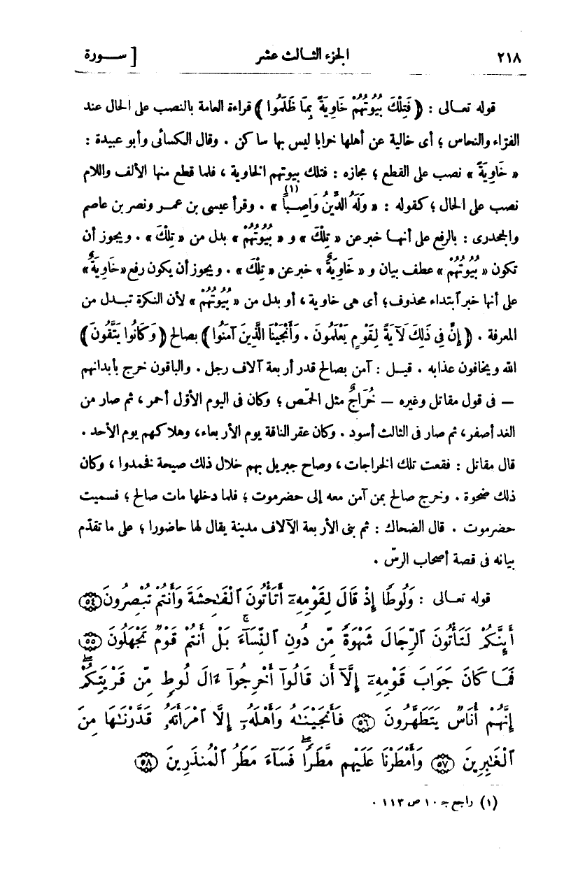 قَوْلُهُ تَعَالَى: (فَتِلْكَ بُيُوتُهُمْ خاوِيَةً بِما ظَلَمُوا) قِرَاءَةُ الْعَامَّةِ بِالنَّصْبِ عَلَى الْحَالِ عِنْدَ الْفَرَّاءِ وَالنَّحَّاسِ، أَيْ خَالِيَةً عَنْ أَهْلِهَا خَرَابًا لَيْسَ بِهَا سَاكِنٌ. وَقَالَ الْكِسَائِيُّ وَأَبُو عُبَيْدَةَ:" خَاوِيَةً" نُصِبَ عَلَى الْقَطْعِ، مَجَازُهُ: فَتِلْكَ بُيُوتُهُمُ الْخَاوِيَةُ، فَلَمَّا قُطِعَ مِنْهَا الْأَلِفُ وَاللَّامُ نُصِبَ عَلَى الْحَالِ، كَقَوْلِهِ:" وَلَهُ الدِّينُ واصِباً". وَقَرَأَ عِيسَى بْنُ عُمَرَ وَنَصْرُ بْنُ عَاصِمٍ وَالْجَحْدَرِيُّ: بِالرَّفْعِ عَلَى أَنَّهَا خَبَرٌ عَنْ" تِلْكَ" وَ" بُيُوتُهُمْ" بَدَلٌ مِنْ" تِلْكَ". وَيَجُوزُ أَنْ تَكُونَ" بُيُوتُهُمْ" عَطْفُ بَيَانٍ وَ" خاوِيَةً" خَبَرٌ عَنْ" تِلْكَ". وَيَجُوزُ أَنْ يَكُونَ رُفِعُ" خاوِيَةً" عَلَى أَنَّهَا خَبَرُ ابْتِدَاءٍ مَحْذُوفٍ، أَيْ هِيَ خَاوِيَةٌ، أَوْ بَدَلٌ مِنْ" بُيُوتُهُمْ" لِأَنَّ النَّكِرَةَ تُبْدَلُ مِنَ الْمَعْرِفَةِ. (إِنَّ فِي ذلِكَ لَآيَةً لِقَوْمٍ يَعْلَمُونَ. وَأَنْجَيْنَا الَّذِينَ آمَنُوا) بِصَالِحٍ (وَكانُوا يَتَّقُونَ) اللَّهَ وَيَخَافُونَ عَذَابَهُ. قِيلَ: آمَنَ بِصَالِحٍ قَدْرُ أَرْبَعَةِ آلَافِ رَجُلٍ. وَالْبَاقُونَ خَرَجَ بِأَبْدَانِهِمْ- فِي قَوْلِ مُقَاتِلٍ وَغَيْرِهِ- خُرَّاجٌ مِثْلَ الْحِمَّصِ، وَكَانَ فِي الْيَوْمِ الْأَوَّلِ أَحْمَرَ، ثُمَّ صَارَ مِنَ الْغَدِ أَصْفَرَ، ثُمَّ صَارَ فِي الثَّالِثِ أَسْوَدَ. وَكَانَ عَقْرُ النَّاقَةِ يَوْمَ الْأَرْبِعَاءَ، وَهَلَاكُهُمْ يَوْمَ الْأَحَدِ. قَالَ مُقَاتِلٌ: فُقِعَتْ تِلْكَ الْخُرَّاجَاتُ، وَصَاحَ جِبْرِيلُ بِهِمْ خِلَالَ ذَلِكَ صَيْحَةً فَخَمَدُوا، وَكَانَ ذَلِكَ ضَحْوَةً. وَخَرَجَ صَالِحٌ بِمَنْ آمَنَ مَعَهُ إِلَى حَضْرَمَوْتَ، فَلَمَّا دَخَلَهَا مَاتَ صَالِحٌ، فَسُمِّيَتْ حَضْرَمَوْتُ. قَالَ الضَّحَّاكُ: ثُمَّ بَنَى الْأَرْبَعَةُ الْآلَافِ مَدِينَةً يُقَالُ لَهَا حَاضُورًا، عَلَى مَا تَقَدَّمَ بَيَانُهُ فِي قِصَّةِ أصحاب الرس.