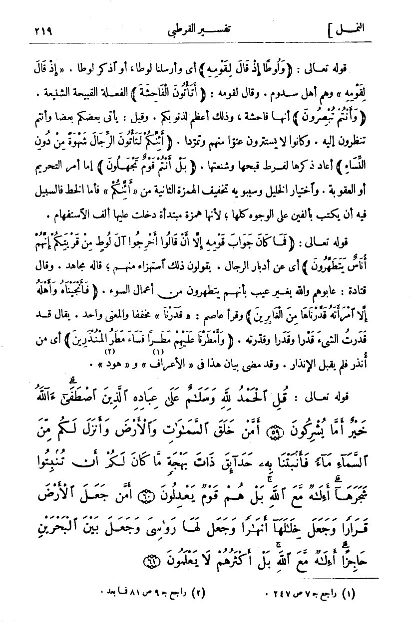 قَوْلُهُ تَعَالَى: (وَلُوطاً إِذْ قالَ لِقَوْمِهِ) أَيْ وَأَرْسَلْنَا لُوطًا، أَوِ اذْكُرْ لُوطًا." إِذْ قالَ لِقَوْمِهِ" وهم أهل سدوم. وقال لقومه: (أَتَأْتُونَ الْفاحِشَةَ) الْفَعْلَةَ الْقَبِيحَةَ الشَّنِيعَةَ. (وَأَنْتُمْ تُبْصِرُونَ) أَنَّهَا فَاحِشَةٌ، وَذَلِكَ أَعْظَمُ لِذُنُوبِكُمْ. وَقِيلَ: يَأْتِي بَعْضُكُمْ بَعْضًا وَأَنْتُمْ تَنْظُرُونَ إِلَيْهِ. وَكَانُوا لَا يستترون عتوا منهم وتمردا. (أَإِنَّكُمْ لَتَأْتُونَ الرِّجالَ شَهْوَةً مِنْ دُونِ النِّساءِ) أَعَادَ ذكرها لفرط قبحها وشنعتها. (بَلْ أَنْتُمْ قَوْمٌ تَجْهَلُونَ) إِمَّا أَمْرَ التَّحْرِيمِ أَوِ الْعُقُوبَةَ. وَاخْتِيَارُ الْخَلِيلِ وَسِيبَوَيْهِ تَخْفِيفُ الْهَمْزَةِ الثانية من" أإنكم" فَأَمَّا الْخَطُّ فَالسَّبِيلُ فِيهِ أَنْ يُكْتَبَ بِأَلِفَيْنِ عَلَى الْوُجُوهِ كُلِّهَا، لِأَنَّهَا هَمْزَةٌ مُبْتَدَأَةٌ دَخَلَتْ عَلَيْهَا أَلِفُ الِاسْتِفْهَامِ. قَوْلُهُ تَعَالَى: (فَما كانَ جَوابَ قَوْمِهِ إِلَّا أَنْ قالُوا أَخْرِجُوا آلَ لُوطٍ مِنْ قَرْيَتِكُمْ إِنَّهُمْ أُناسٌ يَتَطَهَّرُونَ) أَيْ عَنْ أَدْبَارِ الرِّجَالِ. يَقُولُونَ ذَلِكَ اسْتِهْزَاءً مِنْهُمْ، قَالَهُ مُجَاهِدٌ. وَقَالَ قَتَادَةُ: عَابُوهُمْ وَاللَّهِ بِغَيْرِ عَيْبٍ بِأَنَّهُمْ يَتَطَهَّرُونَ مِنْ أَعْمَالِ السُّوءِ. (فَأَنْجَيْناهُ وَأَهْلَهُ إِلَّا امْرَأَتَهُ قَدَّرْناها مِنَ الْغابِرِينَ) وَقَرَأَ عَاصِمٌ:" قَدَرْنَا" مُخَفَّفًا وَالْمَعْنَى وَاحِدٌ. يُقَالُ قَدْ قَدَرْتُ الشَّيْءَ قَدْرًا وَقَدَرًا وَقَدَّرْتُهُ. (وَأَمْطَرْنا عَلَيْهِمْ مَطَراً فَساءَ مَطَرُ الْمُنْذَرِينَ) أَيْ مَنْ أُنْذِرَ فَلَمْ يَقْبَلِ الْإِنْذَارَ. وَقَدْ مَضَى بَيَانُ هَذَا في" الأعراف" «١» و" هود" «٢».
