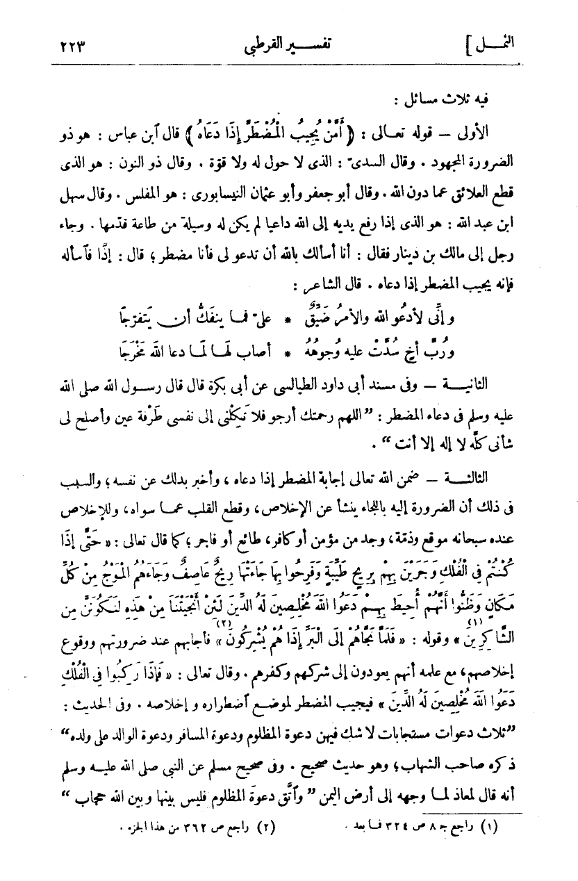 فِيهِ ثَلَاثُ مَسَائِلَ: الْأُولَى- قَوْلُهُ تَعَالَى: (أَمَّنْ يُجِيبُ الْمُضْطَرَّ إِذا دَعاهُ) قَالَ ابْنُ عَبَّاسٍ: هُوَ ذُو الضَّرُورَةِ الْمَجْهُودُ. وَقَالَ السُّدِّيُّ: الَّذِي لَا حَوْلَ لَهُ وَلَا قُوَّةَ. وَقَالَ ذُو النُّونِ: هُوَ الَّذِي قَطَعَ الْعَلَائِقَ عَمَّا دُونَ اللَّهِ. وَقَالَ أَبُو جَعْفَرٍ وَأَبُو عُثْمَانَ النَّيْسَابُورِيُّ هو المفلس. وقال سهل ابن عَبْدِ اللَّهِ: هُوَ الَّذِي إِذَا رَفَعَ يَدَيْهِ إِلَى اللَّهِ دَاعِيًا لَمْ يَكُنْ لَهُ وَسِيلَةٌ مِنْ طَاعَةٍ قَدَّمَهَا. وَجَاءَ رَجُلٌ إِلَى مَالِكِ بن دينار فقال: أنا أسألك با لله أَنْ تَدْعُوَ لِي فَأَنَا مُضْطَرٌّ، قَالَ: إِذًا فَاسْأَلْهُ فَإِنَّهُ يُجِيبُ الْمُضْطَرَّ إِذَا دَعَاهُ. قَالَ الشَّاعِرُ: