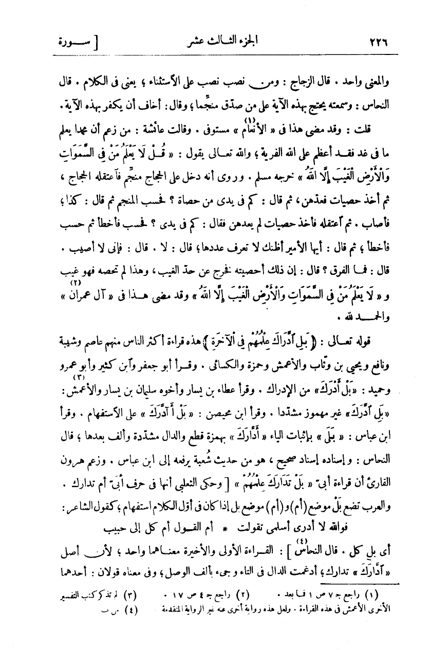 الْفَرَّاءُ: وَإِنَّمَا رُفِعَ مَا بَعْدَ" إِلَّا" لِأَنَّ مَا قَبْلَهَا جَحْدٌ، كَقَوْلِهِ: مَا ذَهَبَ أَحَدٌ إِلَّا أَبُوكَ، وَالْمَعْنَى وَاحِدٌ. قَالَ الزَّجَّاجُ: وَمَنْ نَصَبَ نَصَبَ عَلَى الِاسْتِثْنَاءِ، يَعْنِي فِي الْكَلَامِ. قَالَ النَّحَّاسُ: وَسَمِعْتُهُ يَحْتَجُّ بِهَذِهِ الْآيَةِ عَلَى مَنْ صَدَّقَ مُنَجِّمًا، وَقَالَ: أَخَافُ أَنْ يَكْفُرَ بِهَذِهِ الْآيَةِ. قُلْتُ: وَقَدْ مَضَى هَذَا فِي" الْأَنْعَامِ" «١» مُسْتَوْفًى. وَقَالَتْ عَائِشَةُ: مَنْ زَعَمَ أَنَّ مُحَمَّدًا يَعْلَمُ مَا فِي غَدٍ فَقَدْ أَعْظَمَ عَلَى اللَّهِ الْفِرْيَةَ، وَاللَّهُ تَعَالَى يَقُولُ:" قُلْ لَا يَعْلَمُ مَنْ فِي السَّماواتِ وَالْأَرْضِ الْغَيْبَ إِلَّا اللَّهُ" خَرَّجَهُ مُسْلِمٌ. وَرُوِيَ أَنَّهُ دَخَلَ عَلَى الْحَجَّاجِ مُنَجِّمٌ فَاعْتَقَلَهُ الْحَجَّاجُ، ثُمَّ أَخَذَ حَصَيَاتٍ فَعَدَّهُنَّ، ثُمَّ قَالَ: كَمْ فِي يَدِي مِنْ حَصَاةٍ؟ فَحَسَبَ الْمُنَجِّمُ ثُمَّ قَالَ: كَذَا، فَأَصَابَ. ثُمَّ اعْتَقَلَهُ فَأَخَذَ حَصَيَاتٍ لَمْ يَعُدُّهُنَّ فَقَالَ: كَمْ فِي يَدِي؟ فَحَسَبَ فَأَخْطَأَ ثُمَّ حَسَبَ فَأَخْطَأَ، ثُمَّ قَالَ: أَيُّهَا الْأَمِيرُ أَظُنُّكَ لَا تَعْرِفُ عَدَدَهَا، قَالَ: لَا. قَالَ: فَإِنِّي لَا أُصِيبُ. قَالَ: فَمَا الْفَرْقُ؟ قَالَ: إِنَّ ذَلِكَ أَحْصَيْتَهُ فَخَرَجَ عَنْ حَدِّ الْغَيْبِ، وَهَذَا لَمْ تُحْصِهِ فَهُوَ غَيْبٌ وَ" لَا يَعْلَمُ مَنْ فِي السَّماواتِ وَالْأَرْضِ الْغَيْبَ إِلَّا اللَّهُ" وَقَدْ مَضَى هَذَا فِي" آلِ عِمْرَانَ" «٢» وَالْحَمْدُ لِلَّهِ. قَوْلُهُ تَعَالَى: (بَلِ ادَّارَكَ عِلْمُهُمْ فِي الْآخِرَةِ) هَذِهِ قِرَاءَةُ أَكْثَرِ النَّاسِ مِنْهُمْ عَاصِمٌ وَشَيْبَةُ وَنَافِعٌ وَيَحْيَى بْنُ وَثَّابٍ وَالْأَعْمَشُ وَحَمْزَةُ وَالْكِسَائِيُّ. وَقَرَأَ أَبُو جَعْفَرٍ وَابْنُ كَثِيرٍ وَأَبُو عَمْرٍو وَحُمَيْدٌ:" بَلْ أَدْرَكَ" مِنَ الْإِدْرَاكِ. وَقَرَأَ عَطَاءُ بْنُ يَسَارٍ وَأَخُوهُ سُلَيْمَانُ بْنُ يَسَارٍ وَالْأَعْمَشُ «٣» " بَلْ ادَّرَكَ" غَيْرَ مَهْمُوزٍ مُشَدَّدًا. وَقَرَأَ ابن محيصن:" بل أأدرك" عَلَى الِاسْتِفْهَامِ. وَقَرَأَ ابْنُ عَبَّاسٍ:" بَلَى" بِإِثْبَاتِ الْيَاءِ" أَدَّارَكَ" بِهَمْزَةِ قَطْعٍ وَالدَّالُ مُشَدَّدَةٌ وَأَلِفٌ بَعْدَهَا، قَالَ النَّحَّاسُ: وَإِسْنَادُهُ إِسْنَادٌ صَحِيحٌ، هُوَ مِنْ حَدِيثِ شُعْبَةَ يَرْفَعُهُ إِلَى ابْنِ عَبَّاسٍ. وزعم هرون الْقَارِئُ أَنَّ قِرَاءَةَ أُبَيٍّ" بَلْ تَدَارَكَ عِلْمُهُمْ" الْقِرَاءَةُ الْأُولَى وَالْأَخِيرَةُ مَعْنَاهُمَا وَاحِدٌ، لِأَنَّ أَصْلَ" ادَّارَكَ" تدارك، أدغمت الدال في التاء وجئ بِأَلِفِ الْوَصْلِ، وَفِي مَعْنَاهُ قَوْلَانِ: أَحَدُهُمَا أَنَّ الْمَعْنَى بَلْ تَكَامَلَ عِلْمُهُمْ فِي الْآخِرَةِ، لِأَنَّهُمْ رَأَوْا كُلَّ مَا وُعِدُوا بِهِ مُعَايَنَةً فَتَكَامَلَ علمهم