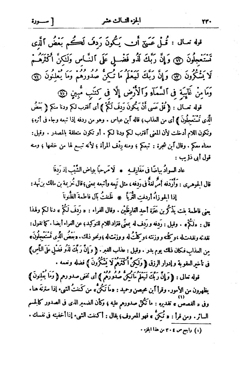 يَعْنِي فَاطِمَةَ بِنْتَ يَذْكُرَ بْنِ عَنَزَةَ أَحَدَ الْقَارِظِينَ. وَقَالَ الْفَرَّاءُ:" رَدِفَ لَكُمْ" دَنَا لَكُمْ وَلِهَذَا قَالَ" لَكُمْ". وَقِيلَ: رَدِفَهُ وَرَدِفَ لَهُ بِمَعْنًى فَتُزَادُ اللَّامُ لِلتَّوْكِيدِ، عَنِ الْفَرَّاءِ أَيْضًا. كَمَا تَقُولُ نَقَدْتُهُ وَنَقَدْتُ لَهُ، وَكِلْتُهُ وَوَزَنْتُهُ، وَكِلْتُ لَهُ وَوَزَنْتُ لَهُ، وَنَحْوَ ذَلِكَ." بَعْضُ الَّذِي تَسْتَعْجِلُونَ" مِنَ الْعَذَابِ فَكَانَ ذَلِكَ يَوْمَ بَدْرٍ. وَقِيلَ: عَذَابُ الْقَبْرِ. (وَإِنَّ رَبَّكَ لَذُو فَضْلٍ عَلَى النَّاسِ) فِي تَأْخِيرِ الْعُقُوبَةِ وَإِدْرَارِ الرِّزْقِ (وَلَكِنَّ أَكْثَرَهُمْ لَا يَشْكُرُونَ) فَضْلَهُ وَنِعَمَهُ. قَوْلُهُ تَعَالَى: (وَإِنَّ رَبَّكَ لَيَعْلَمُ مَا تُكِنُّ صُدُورُهُمْ) أي تخفى صدورهم (وَما يُعْلِنُونَ) يظهرون في الأمور. وَقَرَأَ ابْنُ مُحَيْصِنٍ وَحُمَيْدٍ:" مَا تَكُنُّ" مِنْ كَنَنْتُ الشَّيْءَ إِذَا سَتَرْتُهُ هُنَا. وَفِي" الْقَصَصِ" تَقْدِيرُهُ: مَا تُكِنُّ صُدُورُهُمْ عَلَيْهِ، وَكَأَنَّ الضَّمِيرَ الذي في الصدور كالجسم الساتر. وَمَنْ قَرَأَ:" تُكِنُّ" فَهُوَ الْمَعْرُوفُ، يُقَالُ: أَكْنَنْتُ الشَّيْءَ إِذَا أَخْفَيْتَهُ فِي نَفْسِكَ.