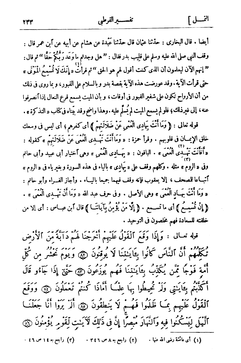 أَيْضًا. قَالَ الْبُخَارِيُّ: حَدَّثَنَا عُثْمَانُ قَالَ حَدَّثَنَا عَبْدَةُ عَنْ هِشَامٍ عَنْ أَبِيهِ عَنِ ابْنِ عُمَرَ قَالَ: وَقَفَ النَّبِيُّ صَلَّى اللَّهُ عَلَيْهِ وَسَلَّمَ عَلَى قَلِيبِ بَدْرٍ فَقَالَ:" هَلْ وَجَدْتُمْ مَا وَعَدَ رَبُّكُمْ حَقًّا" ثُمَّ قَالَ:" إِنَّهُمُ الْآنَ لَيَعْلَمُونَ أَنَّ الَّذِي كُنْتُ أَقُولُ لَهُمْ هُوَ الْحَقُّ" ثُمَّ قَرَأَتْ «١» " إِنَّكَ لَا تُسْمِعُ الْمَوْتى " حَتَّى قَرَأَتِ الْآيَةَ. وَقَدْ عُورِضَتْ هَذِهِ الْآيَةُ بِقِصَّةِ بَدْرٍ وَبِالسَّلَامِ عَلَى الْقُبُورِ، وَبِمَا رُوِيَ فِي ذَلِكَ مِنْ أَنَّ الْأَرْوَاحَ تَكُونُ عَلَى شَفِيرِ الْقُبُورِ فِي أَوْقَاتٍ، وَبِأَنَّ الْمَيِّتَ يَسْمَعُ قَرْعَ النِّعَالِ إِذَا انْصَرَفُوا عَنْهُ، إِلَى غَيْرِ ذَلِكَ، فَلَوْ لَمْ يَسْمَعِ الْمَيِّتُ لَمْ يُسَلَّمْ عَلَيْهِ. وَهَذَا وَاضِحٌ وَقَدْ بَيَّنَّاهُ فِي كِتَابٍ" التَّذْكِرَةِ". قَوْلُهُ تَعَالَى: (وَما أَنْتَ بِهادِي الْعُمْيِ عَنْ ضَلالَتِهِمْ) أَيْ كُفْرِهِمْ، أَيْ لَيْسَ فِي وُسْعِكَ خَلْقُ الْإِيمَانِ فِي قُلُوبِهِمْ. وَقَرَأَ حَمْزَةُ:" وَمَا أَنْتَ تَهْدِي الْعُمْيَ عَنْ ضَلَالَتِهِمْ" كَقَوْلِهِ:" أَفَأَنْتَ تَهْدِي الْعُمْيَ". الْبَاقُونَ:" بِهادِي الْعُمْيِ" وَهِيَ اخْتِيَارُ أَبِي عُبَيْدٍ وَأَبِي حَاتِمٍ وَفِي" الرُّومِ" مِثْلُهُ. وَكُلُّهُمْ وَقَفَ عَلَى" بِهادِي" بِالْيَاءِ فِي هَذِهِ السُّورَةِ وَبِغَيْرِ يَاءٍ فِي" الرُّومِ" اتِّبَاعًا لِلْمُصْحَفِ، إِلَّا يَعْقُوبَ فَإِنَّهُ وَقَفَ فِيهِمَا جَمِيعًا بِالْيَاءِ. وَأَجَازَ الْفَرَّاءُ وَأَبُو حَاتِمٍ:" وَما أَنْتَ بِهادِ الْعُمْيِ" وَهِيَ الْأَصْلُ. وَفِي حَرْفِ عَبْدِ اللَّهِ" وَمَا أَنْ تَهْدِيَ الْعُمْيَ