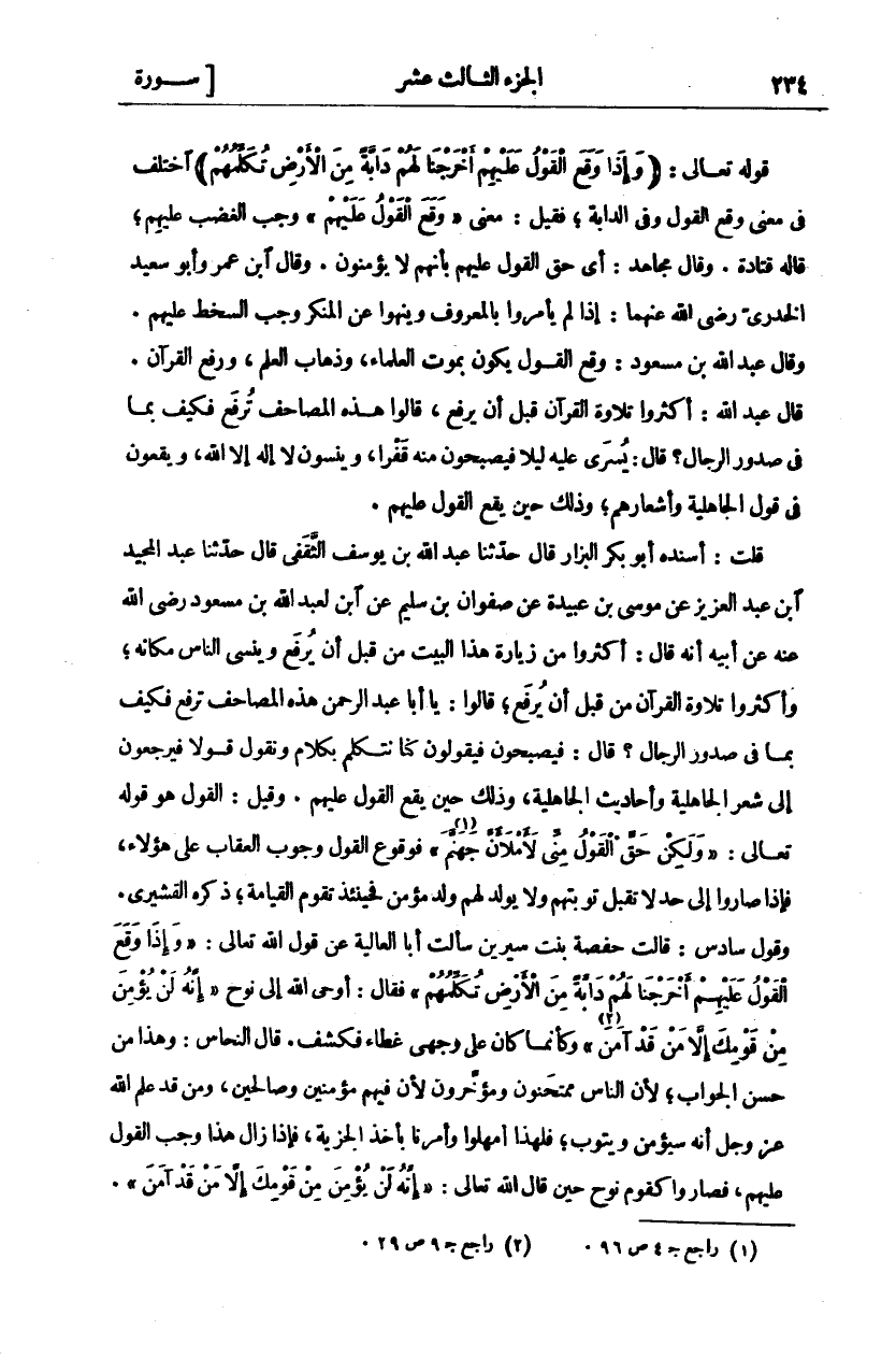 قَوْلُهُ تَعَالَى: (وَإِذا وَقَعَ الْقَوْلُ عَلَيْهِمْ أَخْرَجْنا لَهُمْ دَابَّةً مِنَ الْأَرْضِ تُكَلِّمُهُمْ) اخْتُلِفَ فِي مَعْنَى وَقَعَ الْقَوْلُ وَفِي الدَّابَّةِ، فَقِيلَ: مَعْنَى" وَقَعَ الْقَوْلُ عَلَيْهِمْ" وَجَبَ الْغَضَبُ عَلَيْهِمْ، قَالَهُ قَتَادَةُ. وَقَالَ مُجَاهِدٌ: أَيْ حَقَّ الْقَوْلُ عَلَيْهِمْ بِأَنَّهُمْ لَا يُؤْمِنُونَ. وَقَالَ ابْنُ عُمَرَ وَأَبُو سَعِيدٍ الْخُدْرِيُّ رَضِيَ اللَّهُ عَنْهُمَا: إِذَا لَمْ يَأْمُرُوا بِالْمَعْرُوفِ وَيَنْهَوْا عَنِ الْمُنْكَرِ وَجَبَ السَّخَطُ عَلَيْهِمْ. وَقَالَ عَبْدُ اللَّهِ بْنُ مَسْعُودٍ: وَقْعُ الْقَوْلِ يَكُونُ بِمَوْتِ الْعُلَمَاءِ، وَذَهَابِ الْعِلْمِ، وَرَفْعِ الْقُرْآنِ. قَالَ عَبْدُ اللَّهِ: أَكْثِرُوا تِلَاوَةَ الْقُرْآنِ قَبْلَ أَنْ يُرْفَعَ، قَالُوا هَذِهِ الْمَصَاحِفُ تُرْفَعُ فَكَيْفَ بِمَا فِي صُدُورِ الرِّجَالِ؟ قَالَ: يُسْرَى عَلَيْهِ لَيْلًا فَيُصْبِحُونَ مِنْهُ قَفْرًا، وَيَنْسَوْنَ لَا إِلَهَ إِلَّا اللَّهُ، وَيَقَعُونَ فِي قَوْلِ الْجَاهِلِيَّةِ وَأَشْعَارِهِمْ، وَذَلِكَ حِينَ يَقَعُ الْقَوْلُ عَلَيْهِمْ. قُلْتُ: أَسْنَدَهُ أَبُو بَكْرٍ الْبَزَّارُ قَالَ حَدَّثَنَا عَبْدُ اللَّهِ بْنُ يُوسُفَ الثَّقَفِيُّ قَالَ حَدَّثَنَا عَبْدُ الْمَجِيدِ بْنُ عَبْدِ الْعَزِيزِ عَنْ مُوسَى بْنِ عُبَيْدَةَ عَنْ صَفْوَانَ بْنِ سُلَيْمٍ عَنِ ابْنٍ لِعَبْدِ اللَّهِ بْنِ مَسْعُودٍ رَضِيَ اللَّهُ عَنْهُ عَنْ أَبِيهِ أَنَّهُ قَالَ: أَكْثِرُوا مِنْ زِيَارَةِ هَذَا الْبَيْتِ مِنْ قَبْلِ أَنْ يُرْفَعَ وَيَنْسَى النَّاسُ مَكَانَهُ، وَأَكْثِرُوا تِلَاوَةَ الْقُرْآنِ مِنْ قَبْلِ أَنْ يُرْفَعَ، قَالُوا: يَا أَبَا عَبْدِ الرَّحْمَنِ هَذِهِ الْمَصَاحِفُ تُرْفَعُ فَكَيْفَ بِمَا فِي صُدُورِ الرِّجَالِ؟ قَالَ: فَيُصْبِحُونَ فَيَقُولُونَ كُنَّا نَتَكَلَّمُ بِكَلَامٍ وَنَقُولُ قَوْلًا فَيَرْجِعُونَ إِلَى شِعْرِ الْجَاهِلِيَّةِ وَأَحَادِيثِ الْجَاهِلِيَّةِ، وَذَلِكَ حِينَ يَقَعُ الْقَوْلُ عَلَيْهِمْ. وَقِيلَ: الْقَوْلُ هُوَ قَوْلُهُ تَعَالَى:" وَلكِنْ حَقَّ الْقَوْلُ مِنِّي لَأَمْلَأَنَّ جَهَنَّمَ" فَوُقُوعُ الْقَوْلِ وُجُوبُ الْعِقَابِ عَلَى هَؤُلَاءِ، فَإِذَا صَارُوا إِلَى حَدٍّ لَا تُقْبَلُ تَوْبَتُهُمْ وَلَا يُولَدُ لَهُمْ وَلَدٌ مُؤْمِنٌ فَحِينَئِذٍ تَقُومُ الْقِيَامَةُ، ذَكَرَهُ الْقُشَيْرِيُّ. وَقَوْلٌ سَادِسٌ: قَالَتْ حَفْصَةُ بِنْتُ سِيرِينَ سَأَلْتُ أَبَا الْعَالِيَةِ عَنْ قَوْلِ اللَّهِ تَعَالَى:" وَإِذا وَقَعَ الْقَوْلُ عَلَيْهِمْ أَخْرَجْنا لَهُمْ دَابَّةً مِنَ الْأَرْضِ تُكَلِّمُهُمْ" فَقَالَ: أَوْحَى اللَّهُ إِلَى نُوحٍ" أَنَّهُ لَنْ يُؤْمِنَ مِنْ قَوْمِكَ إِلَّا مَنْ قَدْ آمَنَ" وَكَأَنَّمَا كَانَ عَلَى وَجْهِي غِطَاءٌ فَكُشِفَ. قَالَ النَّحَّاسُ: وَهَذَا مِنْ حَسَنِ الْجَوَابِ، لِأَنَّ النَّاسَ مُمْتَحَنُونَ وَمُؤَخَّرُونَ لِأَنَّ فِيهِمْ مُؤْمِنِينَ وَصَالِحِينَ، وَمَنْ قَدْ عَلِمَ اللَّهُ عَزَّ وَجَلَّ أَنَّهُ سَيُؤْمِنُ وَيَتُوبُ، فَلِهَذَا أُمْهِلُوا وَأُمِرْنَا بِأَخْذِ الْجِزْيَةِ، فَإِذَا زَالَ هَذَا وَجَبَ الْقَوْلُ عَلَيْهِمْ، فَصَارُوا كَقَوْمِ نُوحٍ حِينَ قَالَ اللَّهُ تَعَالَى:" أَنَّهُ لَنْ يُؤْمِنَ مِنْ قَوْمِكَ إِلَّا مَنْ قَدْ آمَنَ".