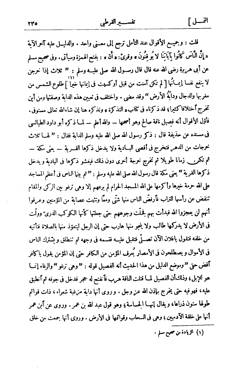 قُلْتُ: وَجَمِيعُ الْأَقْوَالِ عِنْدَ التَّأَمُّلِ تَرْجِعُ إِلَى مَعْنًى وَاحِدٍ. وَالدَّلِيلُ عَلَيْهِ آخِرُ الْآيَةِ" أَنَّ النَّاسَ كانُوا بِآياتِنا لا يُوقِنُونَ" وقرى" أَنَّ" بِفَتْحِ الْهَمْزَةِ وَسَيَأْتِي. وَفِي صَحِيحِ مُسْلِمٍ عَنْ أَبِي هُرَيْرَةَ رَضِيَ اللَّهُ عَنْهُ قَالَ قَالَ رَسُولُ اللَّهِ صَلَّى اللَّهُ عَلَيْهِ وَسَلَّمَ:" ثَلَاثٌ إِذَا خَرَجْنَ لَا يَنْفَعُ نَفْسًا إِيمَانُهَا [لَمْ تَكُنْ آمَنَتْ مِنْ قَبْلُ أَوْ كَسَبَتْ في إيمانها خير «١»] طُلُوعُ الشَّمْسِ مِنْ مَغْرِبِهَا وَالدَّجَّالُ وَدَابَّةُ الْأَرْضِ" وَقَدْ مَضَى. وَاخْتُلِفَ فِي تَعْيِينِ هَذِهِ الدَّابَّةِ وَصِفَتِهَا وَمِنْ أَيْنَ تَخْرُجُ اخْتِلَافًا كَثِيرًا، قَدْ ذَكَرْنَاهُ فِي كِتَابِ" التَّذْكِرَةِ" وَنَذْكُرُهُ هُنَا إِنْ شَاءَ اللَّهُ تَعَالَى مُسْتَوْفًى. فَأَوَّلُ الْأَقْوَالِ أَنَّهُ فَصِيلُ نَاقَةِ صَالِحٍ وَهُوَ أَصَحُّهَا- وَاللَّهُ أَعْلَمُ- لِمَا ذَكَرَهُ أَبُو دَاوُدَ الطَّيَالِسِيُّ فِي مُسْنَدِهِ عَنْ حُذَيْفَةَ قَالَ: ذَكَرَ رَسُولُ اللَّهِ صَلَّى اللَّهُ عَلَيْهِ وَسَلَّمَ الدَّابَّةَ فَقَالَ:" لَهَا ثَلَاثُ خَرْجَاتٍ مِنَ الدَّهْرِ فَتَخْرُجُ فِي أَقْصَى الْبَادِيَةِ وَلَا يَدْخُلُ ذِكْرُهَا الْقَرْيَةَ- يَعْنِي مَكَّةَ- ثُمَّ تكمن زمانا طويلا ثم تحرج خَرْجَةً أُخْرَى دُونَ ذَلِكَ فَيَفْشُو ذِكْرُهَا فِي الْبَادِيَةِ وَيَدْخُلُ ذِكْرُهَا الْقَرْيَةَ" يَعْنِي مَكَّةَ قَالَ رَسُولُ اللَّهِ صَلَّى اللَّهُ عَلَيْهِ وَسَلَّمَ:" ثُمَّ بَيْنَمَا النَّاسُ فِي أَعْظَمِ الْمَسَاجِدِ عَلَى اللَّهِ حُرْمَةً خَيْرِهَا وَأَكْرَمِهَا عَلَى اللَّهِ الْمَسْجِدِ الْحَرَامِ لَمْ يَرُعْهُمْ إِلَّا وَهِيَ تَرْغُو بَيْنَ الرُّكْنِ وَالْمَقَامِ تَنْفُضُ عَنْ رَأْسِهَا التُّرَابَ فَارْفَضَّ النَّاسُ منها شتى ومعا وثبتت عصابة من المؤمنين وعرفوا أنهم لم يُعْجِزُوا اللَّهَ فَبَدَأَتْ بِهِمْ فَجَلَتْ وُجُوهَهُمْ حَتَّى جَعَلَتْهَا كَأَنَّهَا الْكَوْكَبُ الدُّرِّيُّ وَوَلَّتْ فِي الْأَرْضِ لَا يُدْرِكُهَا طَالِبٌ وَلَا يَنْجُو مِنْهَا هَارِبٌ حَتَّى إِنَّ الرَّجُلَ لَيَتَعَوَّذُ مِنْهَا بِالصَّلَاةِ فَتَأْتِيهِ مِنْ خَلْفِهِ فَتَقُولُ يَا فُلَانُ الْآنَ تُصَلِّي فَتُقْبِلُ عَلَيْهِ فَتَسِمُهُ فِي وَجْهِهِ ثُمَّ تَنْطَلِقُ وَيَشْتَرِكُ النَّاسُ فِي الْأَمْوَالِ وَيَصْطَلِحُونَ فِي الْأَمْصَارِ يُعْرَفُ الْمُؤْمِنُ مِنَ الْكَافِرِ حَتَّى إِنَّ الْمُؤْمِنَ يَقُولُ يَا كَافِرُ اقْضِ حَقِّي". وَمَوْضِعُ الدَّلِيلِ من هذا الحديث أنه الفصيل قول:" وَهِيَ تَرْغُو" وَالرُّغَاءُ إِنَّمَا هُوَ لِلْإِبِلِ، وَذَلِكَ أَنَّ الْفَصِيلَ لَمَّا قُتِلَتِ النَّاقَةُ هَرَبَ فَانْفَتَحَ لَهُ حَجَرٌ فَدَخَلَ فِي جَوْفِهِ ثُمَّ انْطَبَقَ عَلَيْهِ، فَهُوَ فِيهِ حَتَّى يَخْرُجَ بِإِذْنِ اللَّهِ عَزَّ وَجَلَّ. وَرُوِيَ أَنَّهَا دَابَّةٌ مُزَغَّبَةٌ شَعْرَاءُ، ذَاتُ قَوَائِمَ طُولُهَا سِتُّونَ ذِرَاعًا، وَيُقَالُ