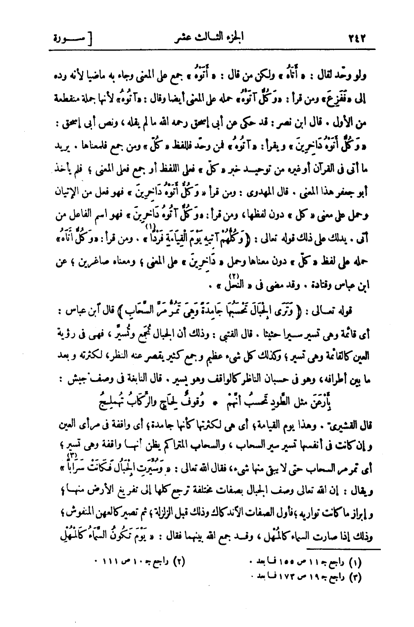 وَلَوْ وَحَّدَ لَقَالَ:" أَتَاهُ" وَلَكِنْ مَنْ قَالَ:" أَتَوْهُ" جَمَعَ عَلَى الْمَعْنَى وَجَاءَ بِهِ مَاضِيًا لأنه رده إلى" فَزَعٍ" وَمَنْ قَرَأَ" وَكُلٌّ آتَوْهُ" حَمَلَهُ عَلَى الْمَعْنَى أَيْضًا وَقَالَ:" آتُوهُ" لِأَنَّهَا جُمْلَةٌ مُنْقَطِعَةٌ مِنَ الأول قال ابن نصر: حُكِيَ عَنْ أَبِي إِسْحَاقَ رَحِمَهُ اللَّهُ مَا لَمْ يَقُلْهُ، وَنَصُّ أَبِي إِسْحَاقَ:" وَكُلٌّ أَتَوْهُ داخِرِينَ" وَيُقْرَأُ" آتُوهُ" فَمَنْ وَحَّدَ فَلِلَفْظِ" كُلٌّ" وَمَنْ جَمَعَ فَلِمَعْنَاهَا. يُرِيدُ مَا أَتَى فِي الْقُرْآنِ أَوْ غَيْرِهِ مِنْ تَوْحِيدِ خَبَرِ" كُلِّ" فَعَلَى اللَّفْظِ أَوْ جَمْعٍ فَعَلَى الْمَعْنَى، فَلَمْ يَأْخُذْ أَبُو جَعْفَرٍ هَذَا الْمَعْنَى قَالَ الْمَهْدَوِيُّ: وَمَنْ قَرَأَ" وَكُلٌّ أَتَوْهُ دَاخِرِينَ" فَهُوَ فِعْلٌ مِنَ الْإِتْيَانِ وَحُمِلَ عَلَى مَعْنَى" كُلِّ" دُونِ لَفْظِهَا، وَمَنْ قَرَأَ" وَكُلٌّ آتُوهُ دَاخِرِينَ" فَهُوَ اسْمُ الْفَاعِلِ مِنْ أَتَى. يَدُلُّكَ عَلَى ذَلِكَ قول تَعَالَى:" وَكُلُّهُمْ آتِيهِ يَوْمَ الْقِيامَةِ فَرْداً" وَمَنْ قَرَأَ" وَكُلٌّ أَتَاهُ" حَمَلَهُ عَلَى لَفْظِ" كُلِّ" دُونِ مَعْنَاهَا وَحَمَلَ" داخِرِينَ" عَلَى الْمَعْنَى، وَمَعْنَاهُ صَاغِرِينَ، عَنِ ابْنِ عَبَّاسٍ وَقَتَادَةَ. وَقَدْ مَضَى فِي" النَّحْلِ" «١». قَوْلُهُ تَعَالَى: (وَتَرَى الْجِبالَ تَحْسَبُها جامِدَةً وَهِيَ تَمُرُّ مَرَّ السَّحابِ) قَالَ ابْنُ عَبَّاسٍ: أَيْ قَائِمَةً وَهِيَ تَسِيرُ سَيْرًا حَثِيثًا. قال القتبي: وذلك أن الجال تُجْمَعُ وَتُسَيَّرُ، فَهِيَ فِي رُؤْيَةِ الْعَيْنِ كَالْقَائِمَةِ وَهِيَ تَسِيرُ، وَكَذَلِكَ كُلُّ شَيٍّ عَظِيمٍ وَجَمْعٌ كَثِيرٌ يَقْصُرُ عَنْهُ النَّظَرُ، لِكَثْرَتِهِ وَبُعْدِ مَا بَيْنَ أَطْرَافِهِ، وَهُوَ فِي حُسْبَانِ النَّاظِرِ كَالْوَاقِفِ وَهُوَ يَسِيرُ. قَالَ النَّابِغَةُ فِي وَصْفِ جَيْشٍ: