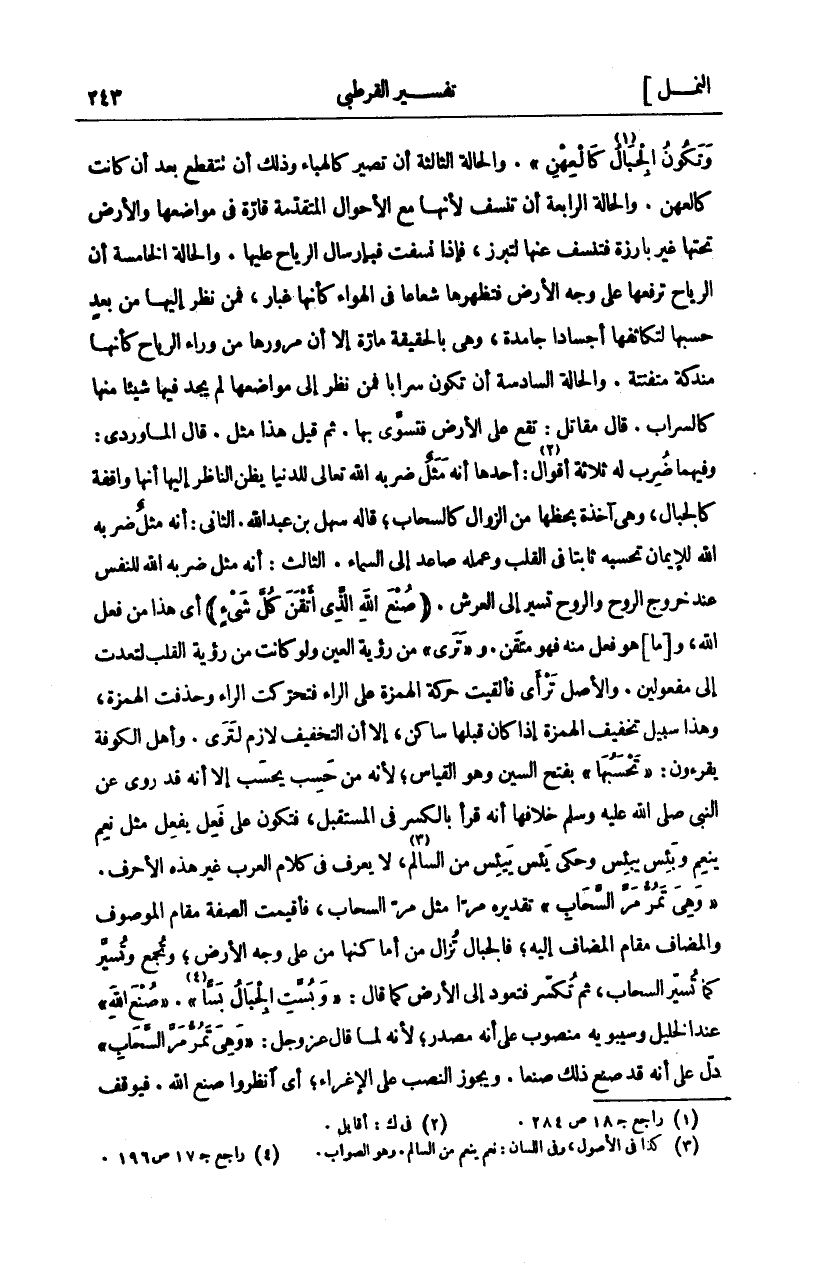 وَالْحَالَةُ الثَّالِثَةُ أَنْ تَصِيرَ كَالْهَبَاءِ وَذَلِكَ أَنْ تنقطع بَعْدَ أَنْ كَانَتْ كَالْعِهْنِ. وَالْحَالَةُ الرَّابِعَةُ أَنْ تُنْسَفَ لِأَنَّهَا مَعَ الْأَحْوَالِ الْمُتَقَدِّمَةِ قَارَّةٌ فِي مَوَاضِعِهَا وَالْأَرْضُ تَحْتَهَا غَيْرُ بَارِزَةٍ فَتُنْسَفُ عَنْهَا لِتَبْرُزَ، فَإِذَا نُسِفَتْ فَبِإِرْسَالِ الرِّيَاحِ عَلَيْهَا. وَالْحَالَةُ الْخَامِسَةُ أَنَّ الرِّيَاحَ تَرْفَعُهَا عَلَى وَجْهِ الْأَرْضِ فَتُظْهِرُهَا شُعَاعًا فِي الْهَوَاءِ كَأَنَّهَا غُبَارٌ، فَمَنْ نَظَرَ إِلَيْهَا مِنْ بُعْدٍ حَسِبَهَا لِتَكَاثُفِهَا أَجْسَادًا جَامِدَةً، وَهِيَ بِالْحَقِيقَةِ مَارَّةٌ إِلَّا إِنَّ مُرُورَهَا مِنْ وَرَاءِ الرِّيَاحِ كَأَنَّهَا مُنْدَكَّةٌ مُتَفَتِّتَةٌ. وَالْحَالَةُ السَّادِسَةُ أَنْ تَكُونَ سَرَابًا فَمَنْ نَظَرَ إِلَى مَوَاضِعِهَا لَمْ يَجِدْ فِيهَا شَيْئًا مِنْهَا كَالسَّرَابِ قَالَ مُقَاتِلٌ: تَقَعُ عَلَى الْأَرْضِ فَتُسَوَّى بِهَا. ثم قيل هذا مثل. قال الماوردي: وفيما ضُرِبَ لَهُ ثَلَاثَةُ أَقْوَالٍ: أَحَدُهَا أَنَّهُ مَثَلٌ ضَرَبَهُ اللَّهُ تَعَالَى لِلدُّنْيَا يَظُنُّ النَّاظِرُ إِلَيْهَا أَنَّهَا وَاقِفَةٌ كَالْجِبَالِ، وَهِيَ آخِذَةٌ بِحَظِّهَا مِنَ الزَّوَالِ كَالسَّحَابِ، قَالَهُ سَهْلُ بْنُ عَبْدِ اللَّهِ. الثَّانِي: أَنَّهُ مَثَلٌ ضَرَبَهُ اللَّهُ لِلْإِيمَانِ تَحْسَبُهُ ثَابِتًا فِي الْقَلْبِ وَعَمَلُهُ صَاعِدٌ إِلَى السَّمَاءِ. الثَّالِثُ: أَنَّهُ مَثَلٌ ضَرَبَهُ اللَّهُ لِلنَّفْسِ عِنْدَ خروج الروح والروح تسير إلى العرش. (صُنْعَ اللَّهِ الَّذِي أَتْقَنَ كُلَّ شَيْءٍ) أَيْ هذا من فعل الله، و [ما] هو فعل منه فهو متقن. وَ" تَرَى" مِنْ رُؤْيَةِ الْعَيْنِ وَلَوْ كَانَتْ مِنْ رُؤْيَةِ الْقَلْبِ لَتَعَدَّتْ إِلَى مَفْعُولَيْنِ. وَالْأَصْلُ تُرْأَى فَأُلْقِيَتْ حَرَكَةُ الْهَمْزَةِ عَلَى الرَّاءِ فَتَحَرَّكَتِ الرَّاءُ وَحُذِفَتِ الْهَمْزَةُ، وَهَذَا سَبِيلُ تَخْفِيفِ الْهَمْزَةِ إِذَا كَانَ قَبْلَهَا سَاكِنٌ، إِلَّا أَنَّ التَّخْفِيفَ لازم لترى. وَأَهْلُ الْكُوفَةِ يَقْرَءُونَ:" تَحْسَبُها" بِفَتْحِ السِّينِ وَهُوَ الْقِيَاسُ، لِأَنَّهُ مِنْ حَسِبَ يَحْسَبُ إِلَّا أَنَّهُ قَدْ رُوِيَ عَنِ النَّبِيِّ صَلَّى اللَّهُ عَلَيْهِ وَسَلَّمَ خِلَافُهَا أَنَّهُ قَرَأَ بِالْكَسْرِ فِي الْمُسْتَقْبَلِ، فَتَكُونُ عَلَى فَعِلَ يَفْعَلُ مِثْلَ نَعِمَ يَنْعَمُ وَبَئِسَ يَبْئَسُ وَحُكِيَ يَئِسَ يَيْئِسُ مِنَ السَّالِمِ، لَا يُعْرَفُ فِي كَلَامِ الْعَرَبِ غَيْرَ هَذِهِ الْأَحْرُفِ" وَهِيَ تَمُرُّ مَرَّ السَّحابِ" تَقْدِيرُهُ مَرًّا مِثْلَ مَرِّ السَّحَابِ، فَأُقِيمَتِ الصِّفَةُ مَقَامَ الْمَوْصُوفِ وَالْمُضَافُ مَقَامَ الْمُضَافِ إِلَيْهِ، فَالْجِبَالُ تُزَالُ مِنْ أَمَاكِنِهَا مِنْ عَلَى وَجْهِ الْأَرْضِ وَتُجْمَعُ وَتُسَيَّرُ كَمَا تُسَيَّرُ السَّحَابِ، ثُمَّ تُكْسَرُ فَتَعُودُ إِلَى الْأَرْضِ كَمَا قَالَ:" وَبُسَّتِ الْجِبالُ بَسًّا". (صُنْعَ اللَّهِ) عِنْدَ الْخَلِيلِ وَسِيبَوَيْهِ مَنْصُوبٌ عَلَى أَنَّهُ مَصْدَرٌ، لِأَنَّهُ لَمَّا قَالَ عَزَّ وَجَلَّ:" وَهِيَ تَمُرُّ مَرَّ السَّحابِ" دَلَّ عَلَى أَنَّهُ قَدْ صَنَعَ ذَلِكَ صُنْعًا وَيَجُوزُ النَّصْبُ عَلَى الْإِغْرَاءِ، أَيِ انْظُرُوا صُنْعَ اللَّهِ. فَيُوقَفُ
